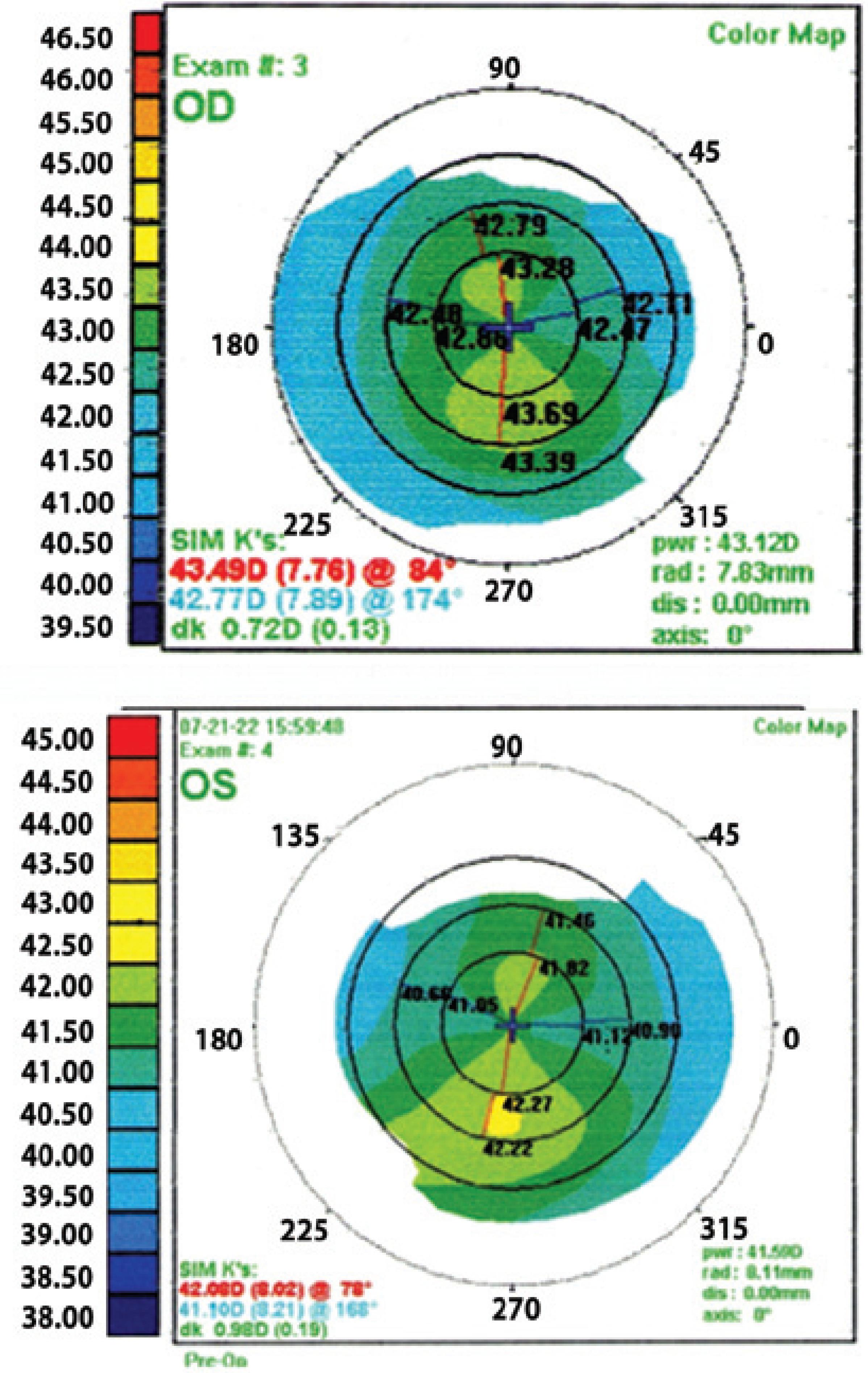 Figure 1 Preoperative corneal topography showing an asymmetry of less than 0.5 diopters in the left eye.