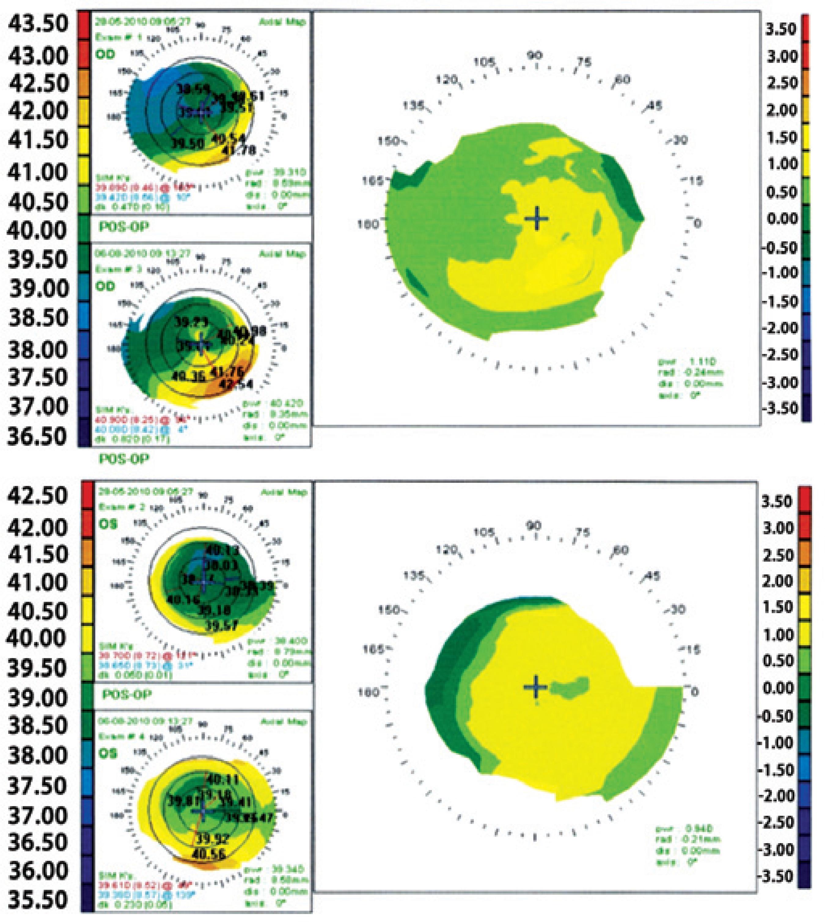 A 28-year-old female was referred to the Universidade Federal de São Paulo (UNIFESP), Department of Refractive Surgery in 2010 for refractive surgery. Her refraction was -3.25 D -0.75 D 160º (OD) and -3.25 D -0.75 D 180º (OS). Corneal topography revealed an asymmetry of less than 0.5 diopters in the left eye (Figure 1). Corneal thickness of right eye was 590 µm and the left eye was 591 µm. We performed wavefront-guided laser-assisted in situ keratomileusis (LASIK) surgery in both the eyes using a Moria M2 microkeratome and LADARVision excimer laser with an ablation depth of 63.8 µm in the right eye and 70.5 µm in the left eye. There were no immediate postoperative complications and the uncorrected visual acuity was 20/20 bilaterally.