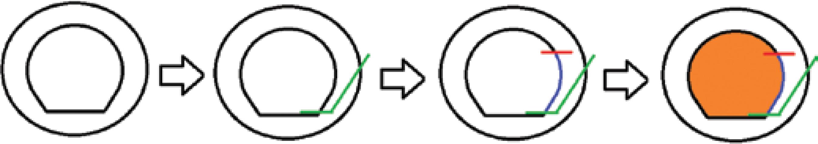 Figure 4 Illustration of the new technique: The flap was partially elevated with a corneal spatula to enable separation of the stroma above and under the flap, but without lifting the entire flap. A 0.1% riboflavin solution was injected into the stroma at 15-minute intervals for 30 minutes and after the crosslinking was performed.