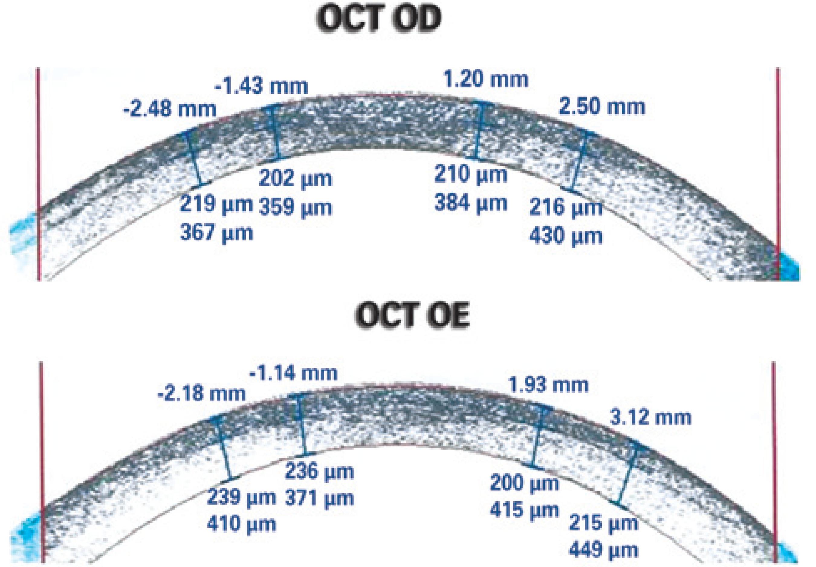 Four months after the procedure, the patient returned with a complaint of decreased visual quality in the right eye. Visual acuity was 20/25 uncorrected and 20/20 with -0.25 D -0.50 D 15º lenses. A comparison of corneal topography findings between postoperative months 1 and 4 (Figure 2) showed inferior corneal steepening (>1 diopter) in the right eye and a diffuse increase in corneal curvature (<1 diopter) in the left eye. Corneal optical coherence tomography (OCT, Figure 3) showed an abnormally thick flap (200-220 µm), whereas aberrometry showed a high RMS (0.84) and an increase in the negative vertical coma. As the patient was scheduled to leave the country within a week for her doctoral studies in Barcelona, we chose to perform under-the-flap intrastromal corneal crosslinking.