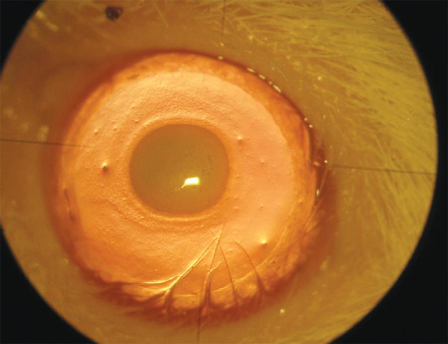 Figure 3 Image of an eye with corneal neovascularization after eight days of treatment. A scar formation can be observed on the central cornea. Neovascularization begins at the limbus and continues towards the burn area.