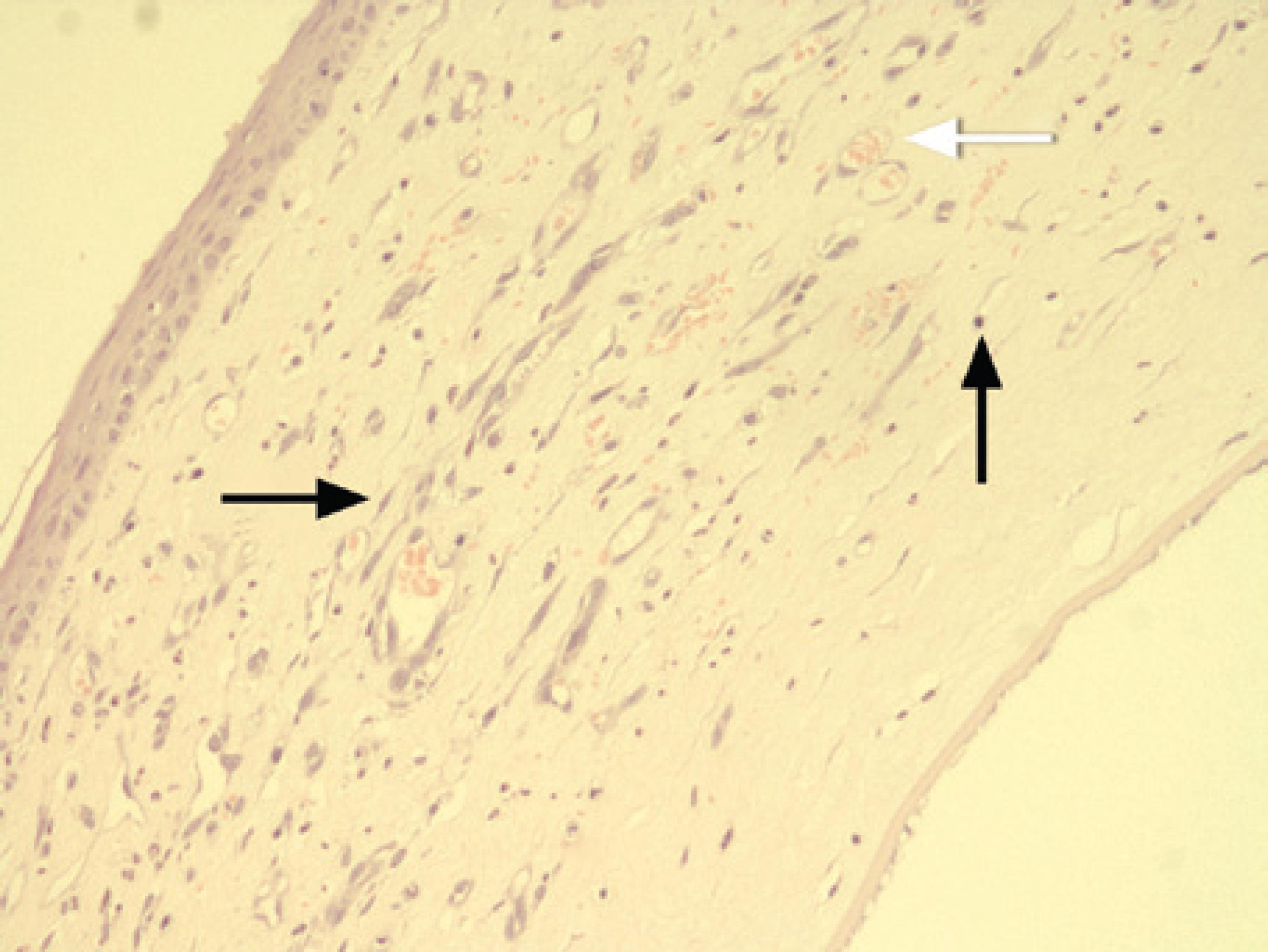 Figure 4 Histopathological preparation of a cornea. Inflammatory cells (thin arrow), fibroblasts (black thick arrow), blood vessels, and stained erythrocytes within the blood vessels (white thick arrow) can be seen. The corneal specimens were stained with hematoxylin-eosin and examined using light microscopy (magnification × 400).
