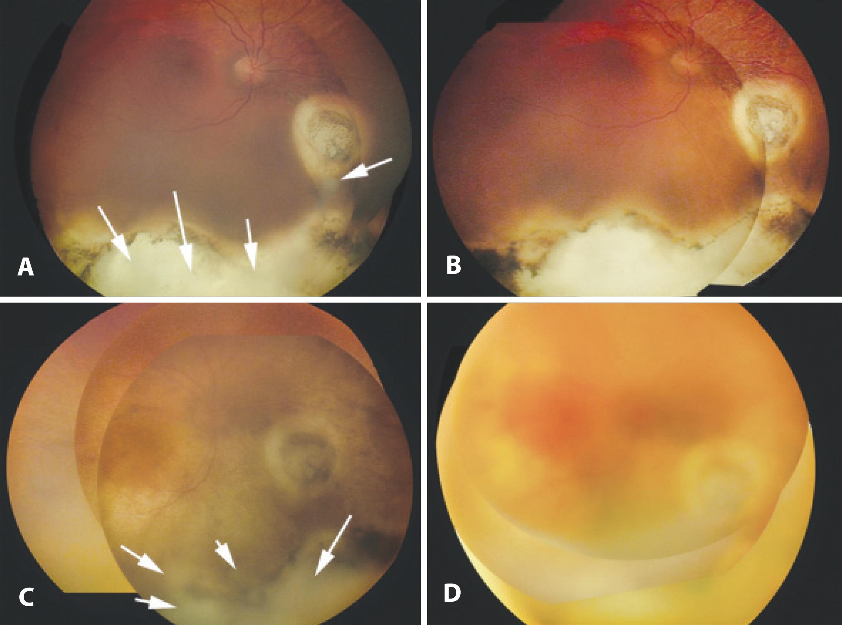 Figure 1 RetCam® photographs of the patient’s right eye at various time points. A) First exam at presentation. Note the extensive chorioretinal scarring inferiorly and poorly differentiated matte of preretinal acellular vitreous seeds. B) Following single-drug ophthalmic artery infusion chemotherapy (OAIC) using topotecan (8 sessions), and single-drug OAIC using melphalan (2 sessions), periocular injection carboplatin (2 sessions). Note the absence of preretinal vitreous seeds on exam. C) Recurrence of vitreous seeds OD 6 months after the completion of the previous treatment. D) Following the completion of intravitreal melphalan. Note the resolution of vitreous seeding.