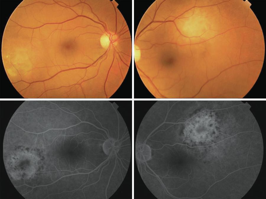Blurred vision is the most commonly presented symptom of uveal metastasis. Other common symptoms include photopsia, scotoma, floaters, metamorphopsia, and ocular pain(2). The symptom of pain is rare in primary uveal malignancies. Typical choroidal metastases show one or more solitary and slightly elevated lesions with depigmentation and hyperpigmentation on the surface. Exudative detachment may or may not be present. It is not possible to know the origin of the lesions from fundus examination alone. Detailed abdominal and thoracal imaging should be performed when rapidly growing choroidal tumors of unknown origin are present(5,8).