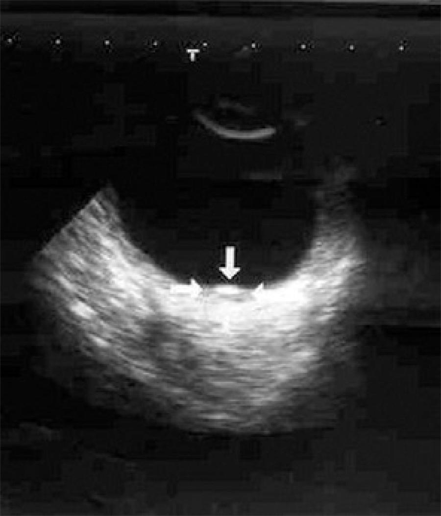 A 49-year-old woman with metastases of pancreatic cancer to liver, spleen, multiple abdominal lymph nodes, and additionally with peritonitis carcinomatosa was presented to the Ophthalmology Department of the Akdeniz University Hospital with a two week history of blurred vision in her left eye two months after the diagnosis. Her best-corrected visual acuities were 20/20 for the right and 20/200 for the left eye. Intraocular pressure and external appearance were normal in both eyes. A slit-lamp examination showed no sign of intraocular inflammation. Fundus examination revealed a white-yellow dome-shaped subretinal mass of 2 optic disc diameters infero-temporal to the macula with minimal subretinal fluid on the right and a white-yellow dome-shaped subretinal mass of approximately 3 optic discs in diameters supero-temporal to the macula with shallow subretinal fluid involving juxtafoveal region (Figure 1). Pigmentary alterations at the border of both lesions were evident. Ocular USG confirmed bilateral choroidal mass, suggestive of metastasis (Figure 2). Although the lesion threatened the vision and demanded radioactive plaque brachytherapy, the medical condition of the patient deteriorated rapidly. Despite further chemotherapy, the patient died six months after the diagnosis of ocular metastasis. During the follow-up bedside exams, a subjective improvement in vision was noted and the left choroidal lesion shrunk to the diameter of one disc with no subretinal fluid. The choroidal dome-shaped mass on the right eye fully regressed and we observed retinal pigmentary changes, two discs in diameter, in place of the original lesion.