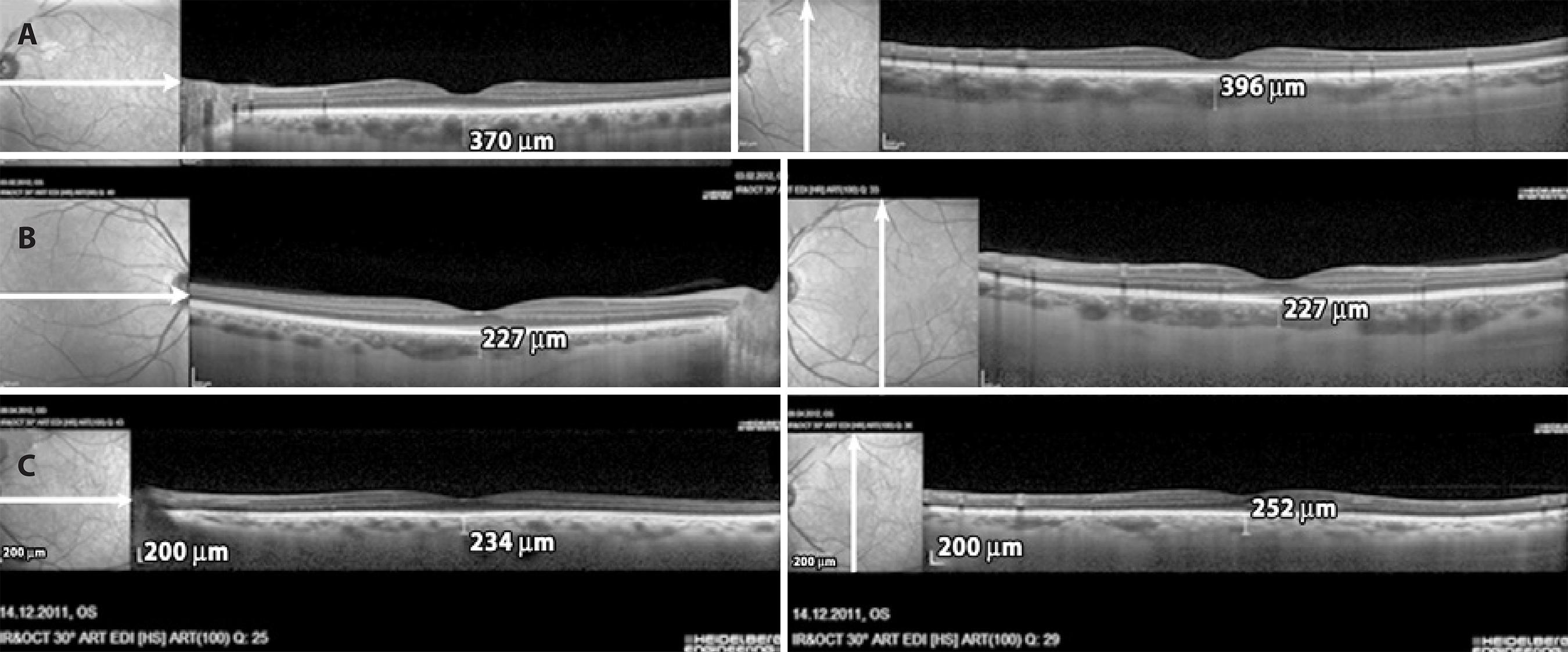 Figure 1 Measurements of subfoveal choroidal thickness using the EDI mode of spectral domain OCT (Spectralis, Heidelberg Engineering, Heidelberg, Germany). A) A mild OSAHS patient; B) A moderate OSAHS patient; C) A severe OSAHS patient.