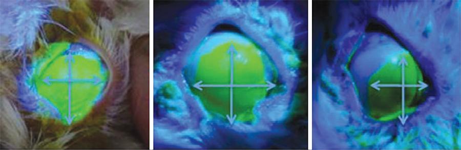 Epithelial defect Mean between the largest horizontal and the largest vertical measurements of the fluorescein-stained epithelial defect, as measured in millimeters using a surgical caliper. (Figure 2)