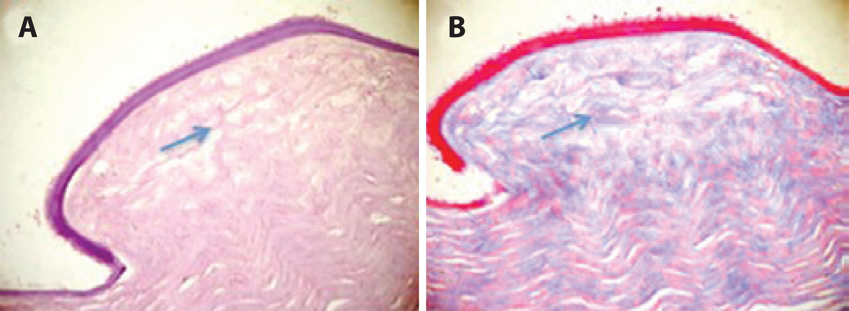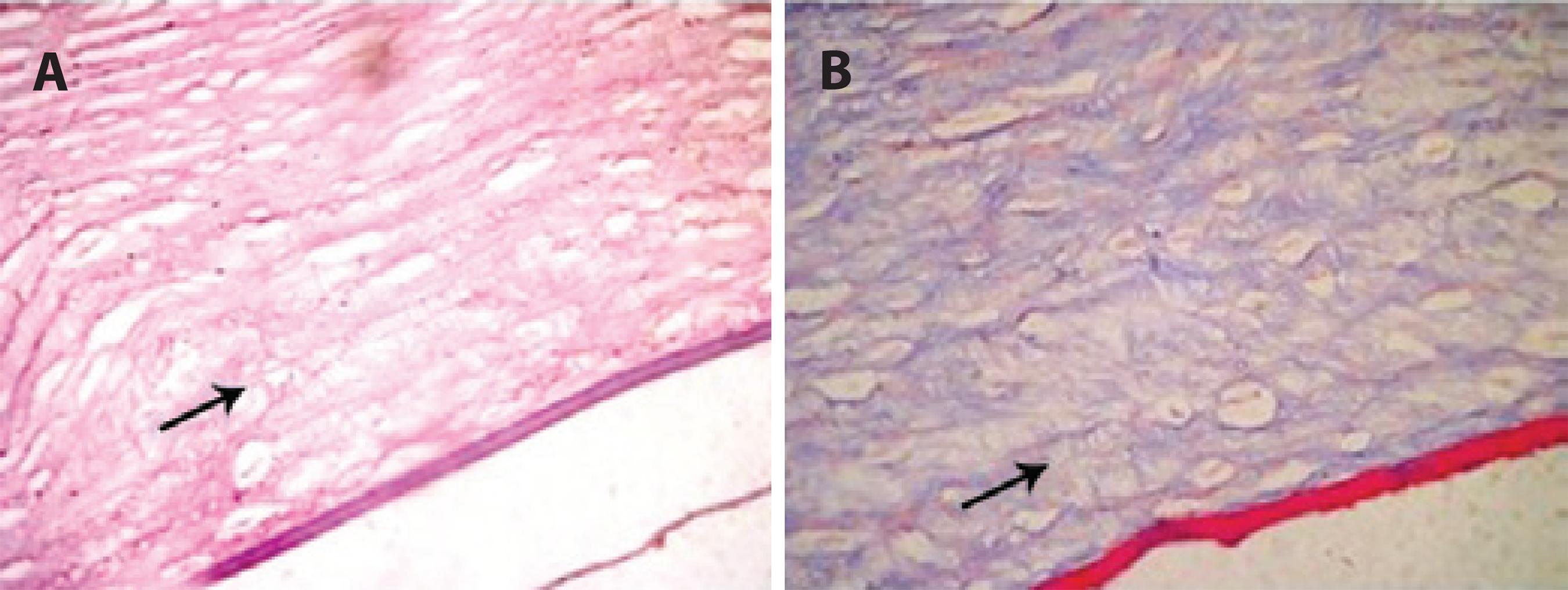 Figure 4 Corneal stroma 30 days after the alkali-burn procedure in the control group. Note the disorganized pattern of collagen fibers and the absence of bridges (arrow) between the stromal fibers. HE staining (A) and trichrome Masson staining (B).
