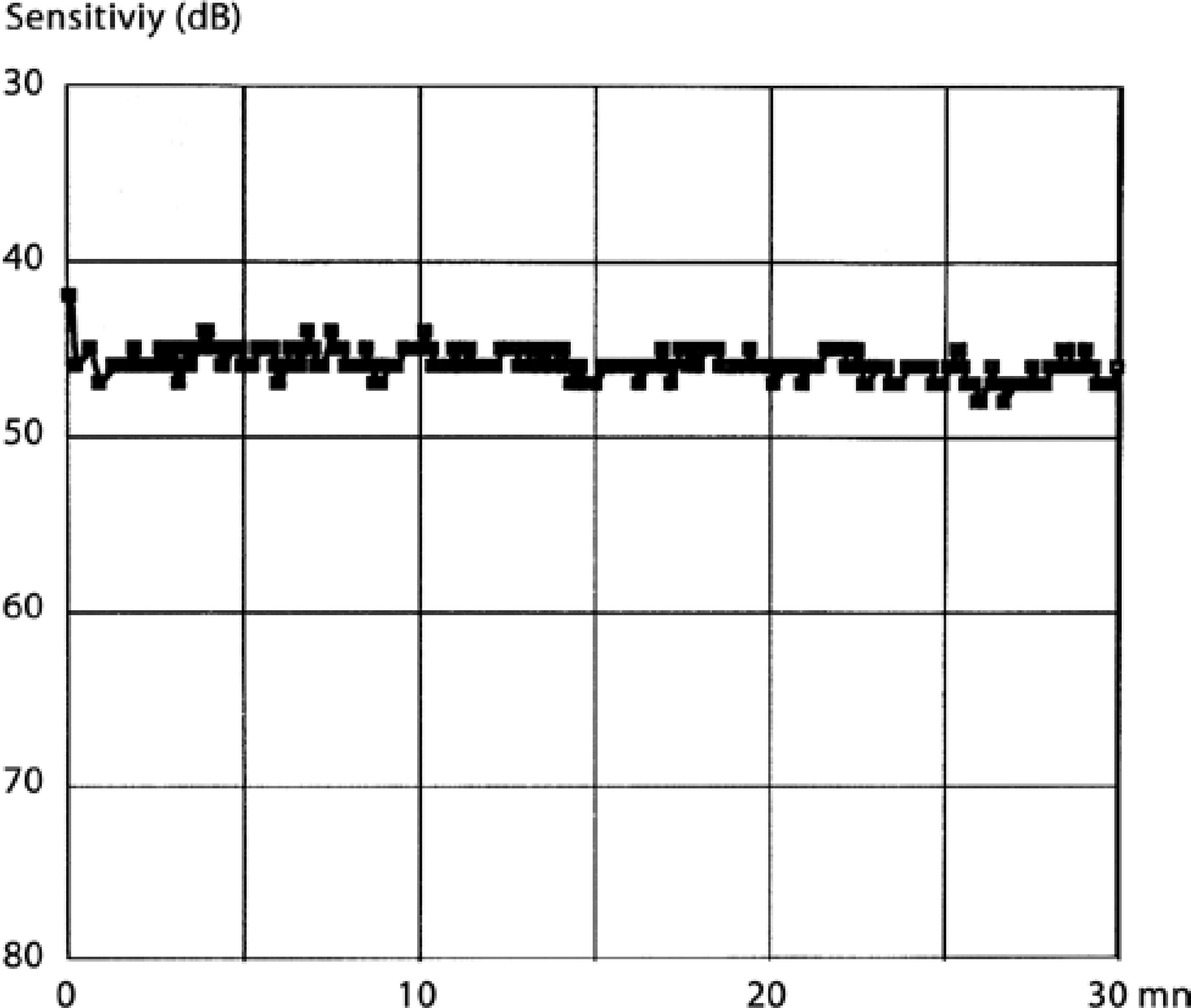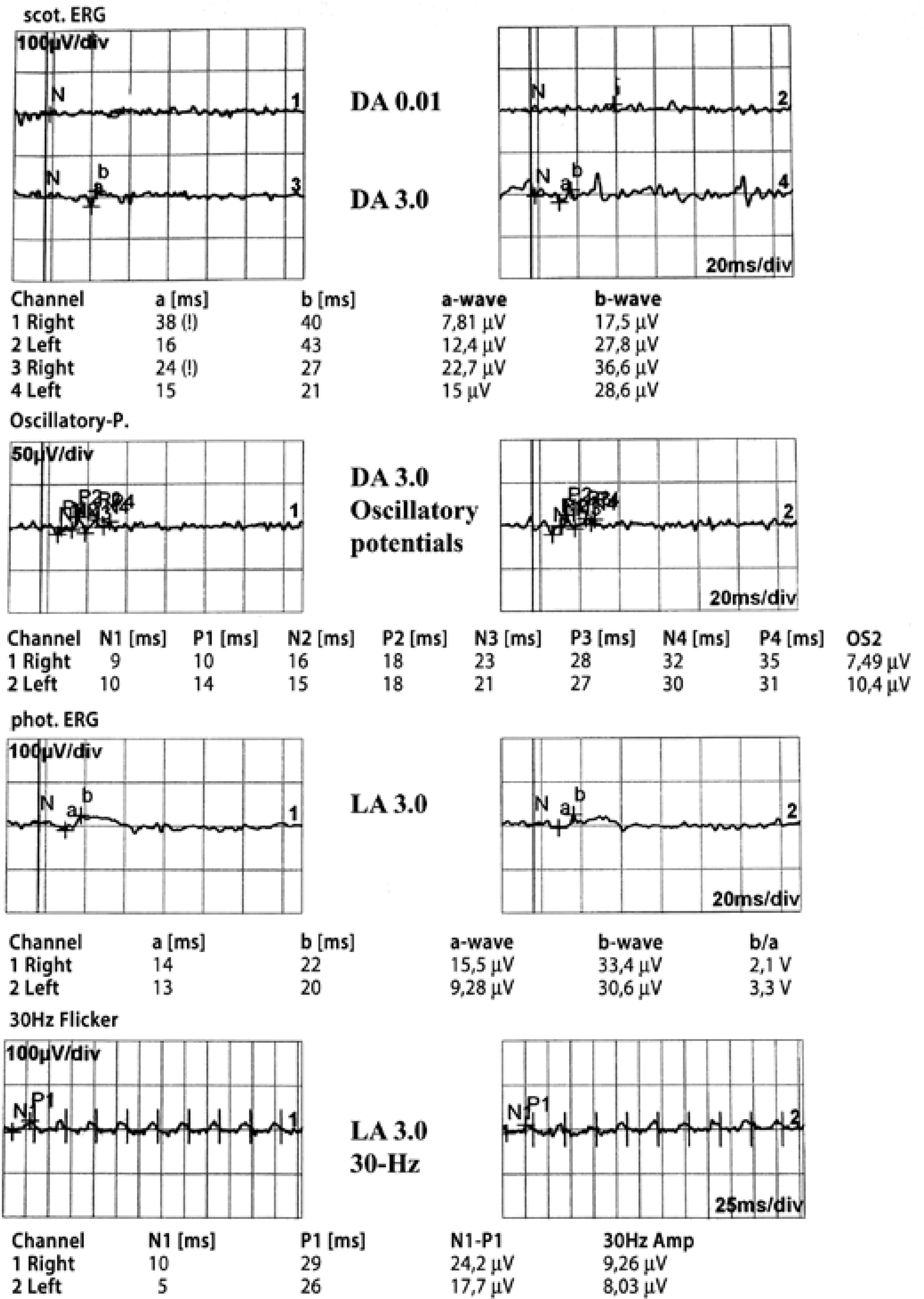 A full field flash electroretinogram analysis was conducted using the standards of the International Society for Clinical Electrophysiology of Vision (ISCEV). DTL electrodes were used. Dark-adapted 0.01 electroretinography (ERG) was non-recordable in both eyes and dark adapted 3.0 ERG was almost non-recordable. The amplitudes of the light-adapted 3.0 ERG and 30 Hz flicker ERG was severely reduced in both eyes (Figure 2). In the dark adaptation curve, a brief initial cone sensitivity increase was detected. No rod-cone break point was observed and no further rod sensitivity increase was detected (Figure 3). Macular high-resolution SD-OCT did not reveal an epiretinal membrane in the central retina of either eye (Figure 4).