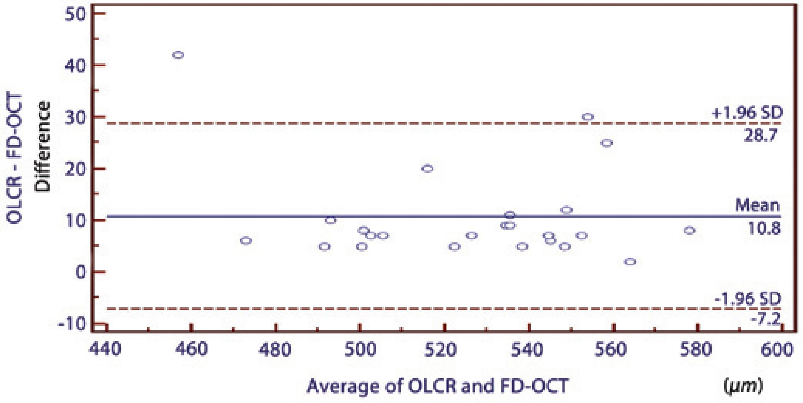 Cruysberg et al.(23) reported that the 95% LOA for the CCT measurement between TD-OCT (Visante) and the same OLCR used in our study was 26 μm, which was slightly narrower than those observed in our study. In their study, the difference between the CCT measurements of the OLCR and the TD-OCT was statistically significant, resulting in higher CCT values using OLCR compared with TD-OCT. The OLCR measurement was also higher than the FD-OCT measurement in our study. O’Donnell et al.(6) also reported that the 95% LOA for the CCT measurement between TD-OCT (Visante) and the same OLCR used in our study was 65.52 μm, which was much wider than those observed in our study. They suggested that CCT measures from these instruments should not be used interchangeably because of poor agreement between these instruments. In our study, reasonable agreement was found between the OLCR and the FD-OCT, in contrast with their study.