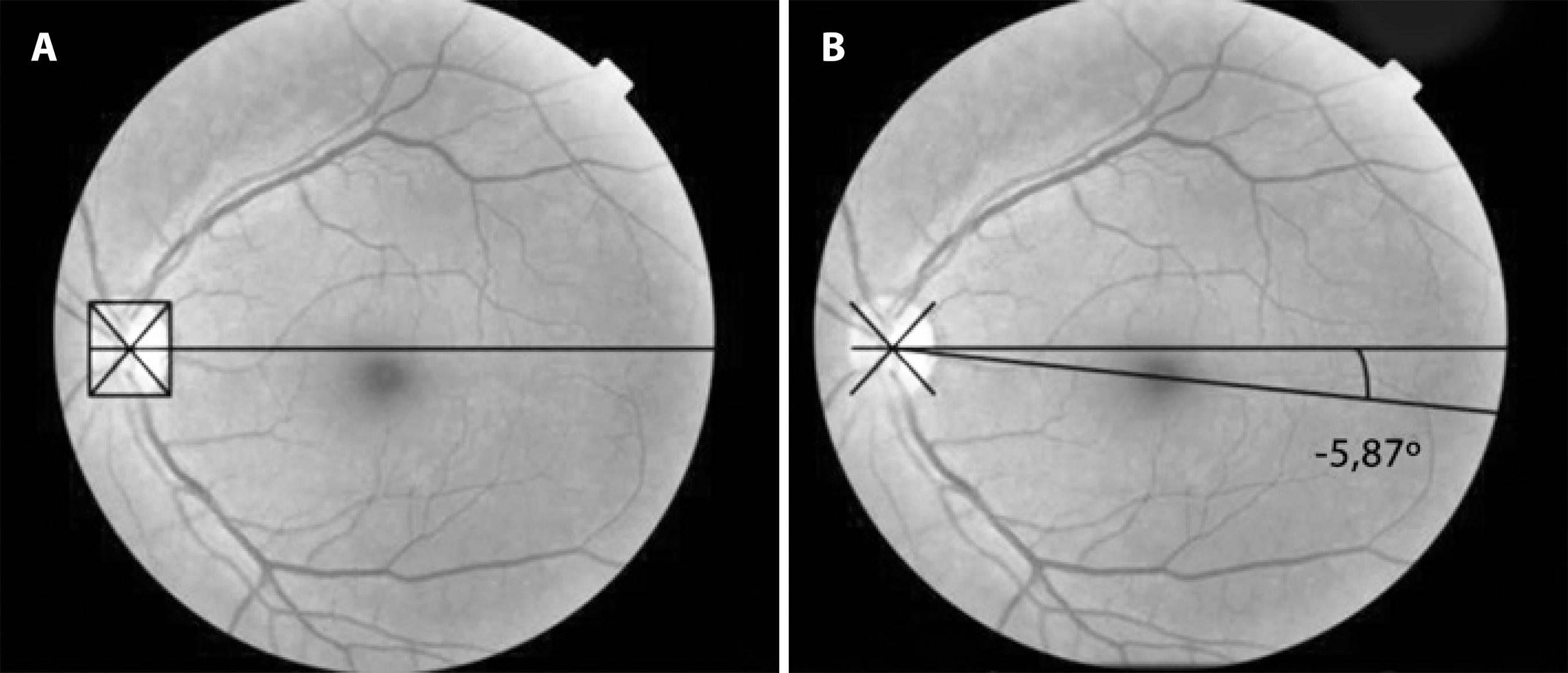 Figure 1 A) Determination of the optic disc center: horizontal line crossing the intersection of the diagonal lines to the center of the optic disc. B) Torsion angle between the centers of the fovea and of the optic disc.