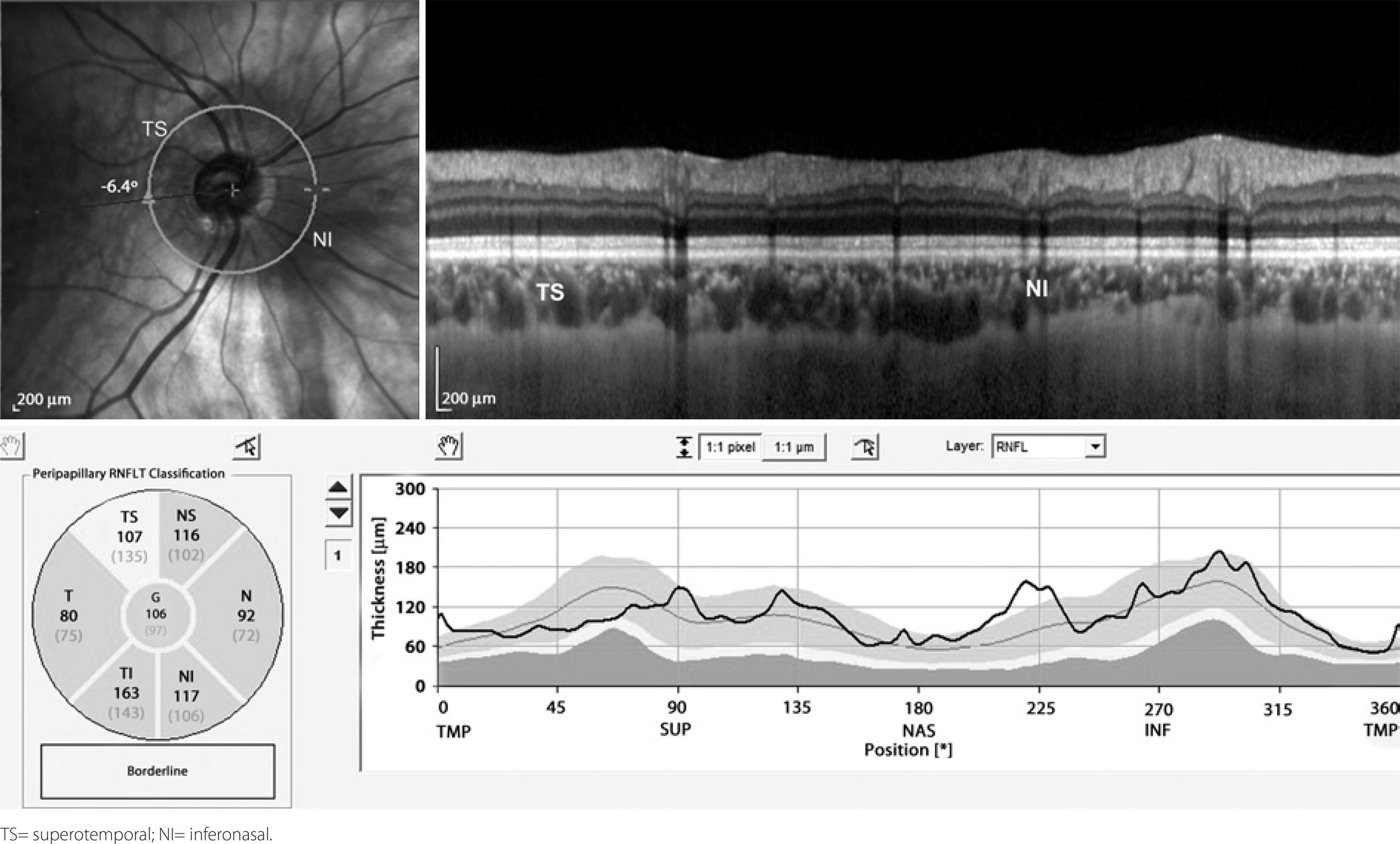 Figure 1 Inferior nasal crescent and superotemporal disc rim elevation with loss of superior retinal nevre fiber layer thickness verified in OCT.