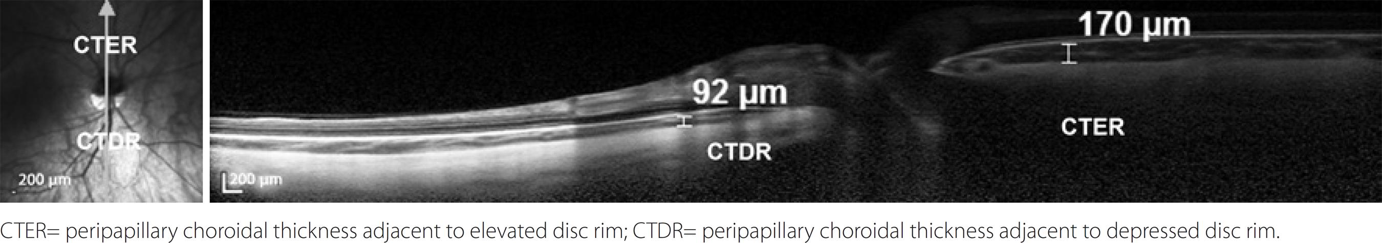 CTER= peripapillary choroidal thickness adjacent to elevated disc rim; CTDR= peripapillary choroidal thickness adjacent to depressed disc rim.