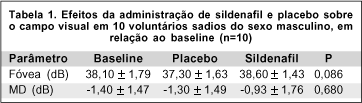 A tabela 1 revela que a administração do sildenafil não alterou significativamente o limiar foveal e o MD em relação ao baseline e ao placebo (Tabela 1).