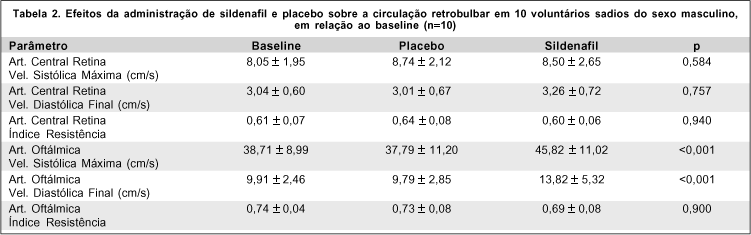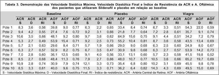A tabela 3 especifica as variações de velocidades da ACR e artéria oftálmica dos pacientes que utilizaram sildenafil e placebo em relação ao baseline.
