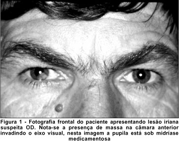 Os autores relatam o caso de um homem branco, com 47 anos, que se apresentou com queixa de baixa da acuidade visual por massa intra-ocular em íris OD invadindo o eixo visual (Figura 1) que foi percebida há 8 meses. Entretanto a perda visual foi notada há 4 meses. O paciente negou quaisquer sintomas sistêmicos durante o último ano. A história pregressa de doenças sistêmicas, trauma ocular e neoplasia, bem como os antecedentes familiares de neoplasia eram negativos. O paciente já havia procurado outro oftalmologista que o orientou a não tratar a lesão. Entretanto, devido à baixa da visão e o aspecto visível da lesão, o paciente decidiu procurar uma segunda opinião médica.