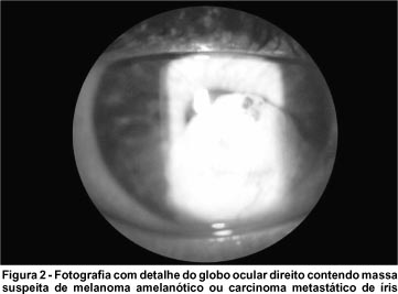 Ao exame oftalmológico, a acuidade visual medida foi movimentos de mão (MM) em olho direito (OD) e 6/6 em olho esquerdo (OE) sem correção. A biomicroscopia do segmento anterior revelou em OD uma massa tumoral localizada às 4 horas, com dimensões de 4,6 mm antero-posterior, 5,2 mm circunferencialmente, e espessura estimada em 2,5 a 2,75 mm obstruindo o ângulo da câmara anterior. A tumoração apresentava coloração esbranquiçada, superfície irregular e proeminente vascularização (Figura 2). OE apresentava-se dentro dos limites da normalidade. A pressão intra-ocular (PO) medida com tonômetro de Perkins foi 18 mmHg OD e 12 mmHg OE. A oftalmoscopia indireta sob midríase medicamentosa não apresentou alterações em ambos os olhos. A ecografia convencional (modo A e B) com sonda de 15 mHz (Mentor Ophthalmic, Norwell, MA) não revelou a margem posterior do tumor.