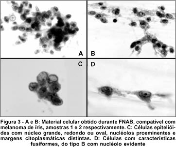 Serviço de Patologia Wills Eye Hospital - Agregados de células tumorais consistentes com melanoma de íris. Algumas células com configuração fusiforme e outras epitelióides, com margens citoplasmáticas distintas. Todas as células contém nucléolo. As células fusiformes são compatíveis com melanoma fusiforme tipo B. As células epitelióides apresentam núcleo grande, redondo ou oval e nucléolo proeminente. Diagnóstico: FNAB consistente com melanoma maligno primário de íris, tipo células mistas (Figura 3).