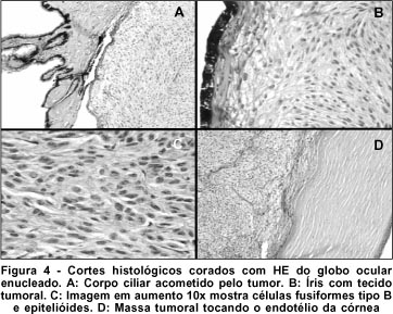 Anatomopatológico: (Macroscópico) globo ocular medindo 2,2 cm de diâmetro, e 1,2 cm de coto de nervo óptico. Externamente e ao corte, apresenta na câmara anterior, junto à íris, lesão nodular pardo-clara, medindo 1 cm no maior diâmetro, invadindo corpo ciliar e coróide anterior. (Microscópico) Melanoma maligno primário de íris, composto por células fusiformes tipo B e algumas células epitelióides. Não há sinais de semeadura tumoral na câmara anterior. O tumor está restrito ao interior do globo ocular (Figura 4).