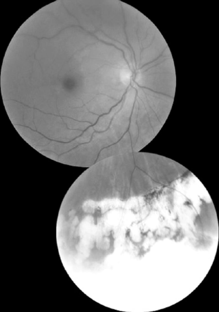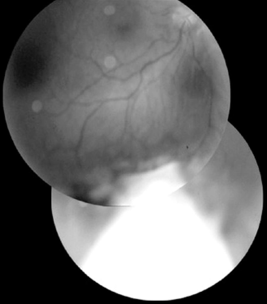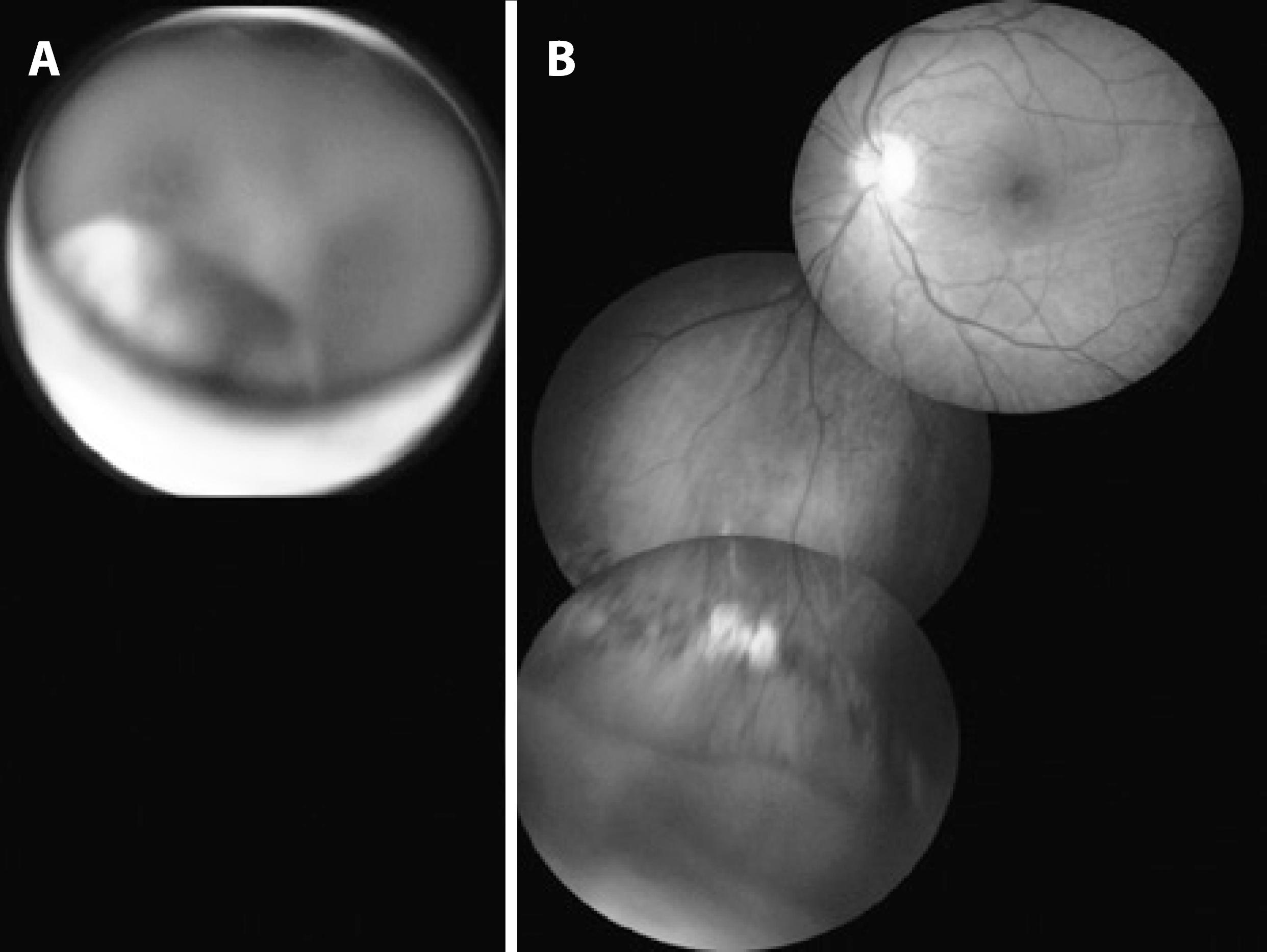 Figure 3 A) Preoperative medulloepithelioma in the ciliary body region. B) Postoperative retinal attachment; the whitish area on the periphery corresponds to tumor resection delimited by photocoagulation marks.