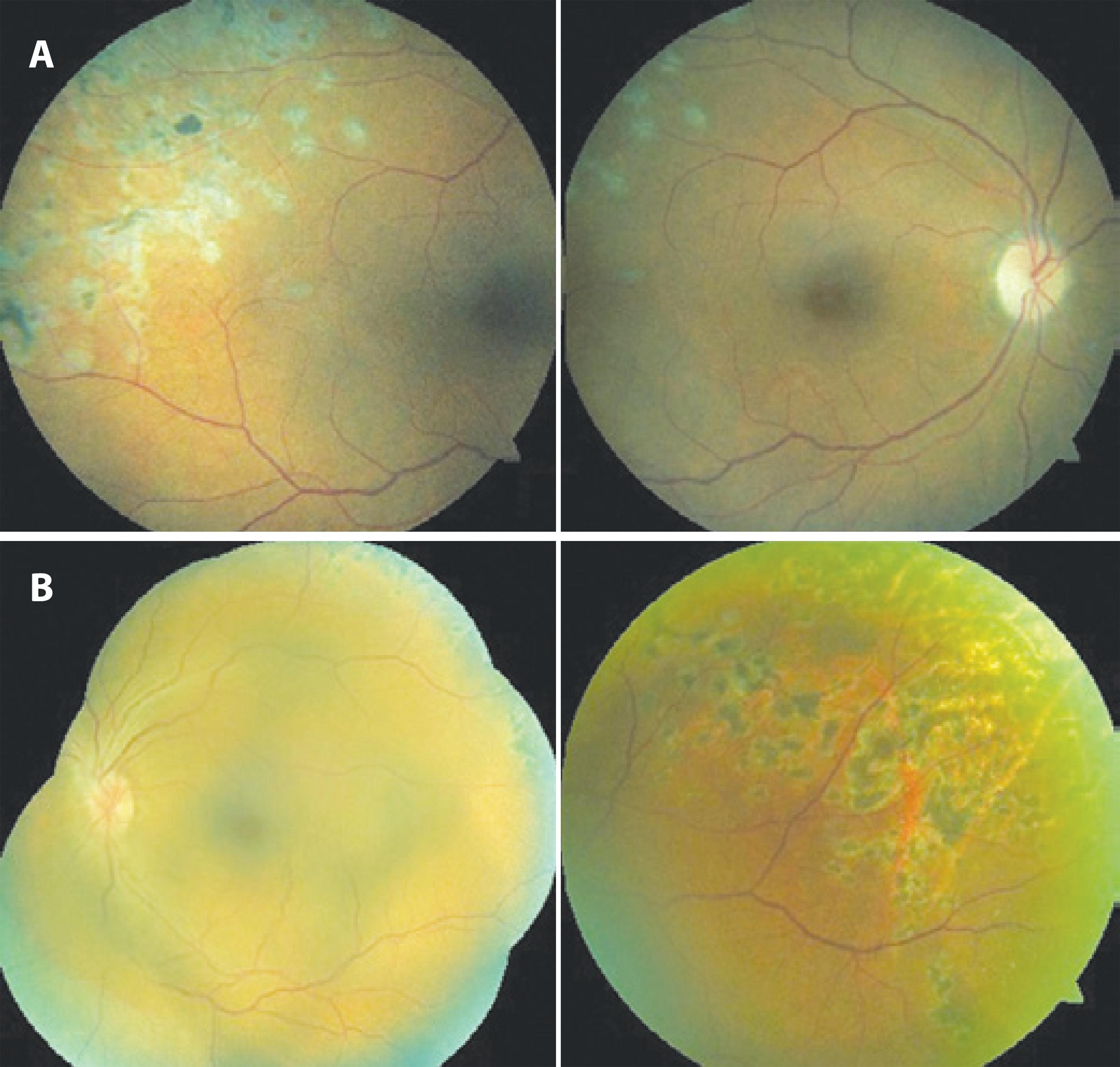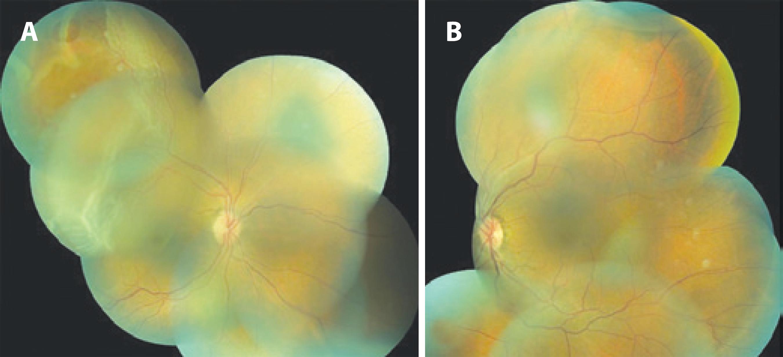 Figure 1 A) Retinal detachment with tears due to senile retinoschisis in the superior temporal quadrant of the right eye; B) Senile retinoschisis in the superior temporal quadrant of the left eye.