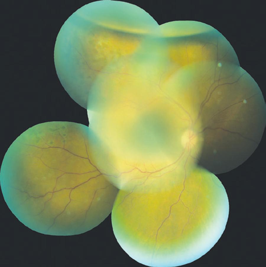PR was performed according to a technique previously described for the LE, with argon laser photocoagulation in the area of retinoschisis. In this instance, the patient's head was inclined upwards slightly over the right shoulder. The patient progressed with retinal attachment in both eyes (Figure 4), showed no relapses associated with retinal detachment after 24 months of follow-up, and remains in periodic outpatient follow-up at our institution.