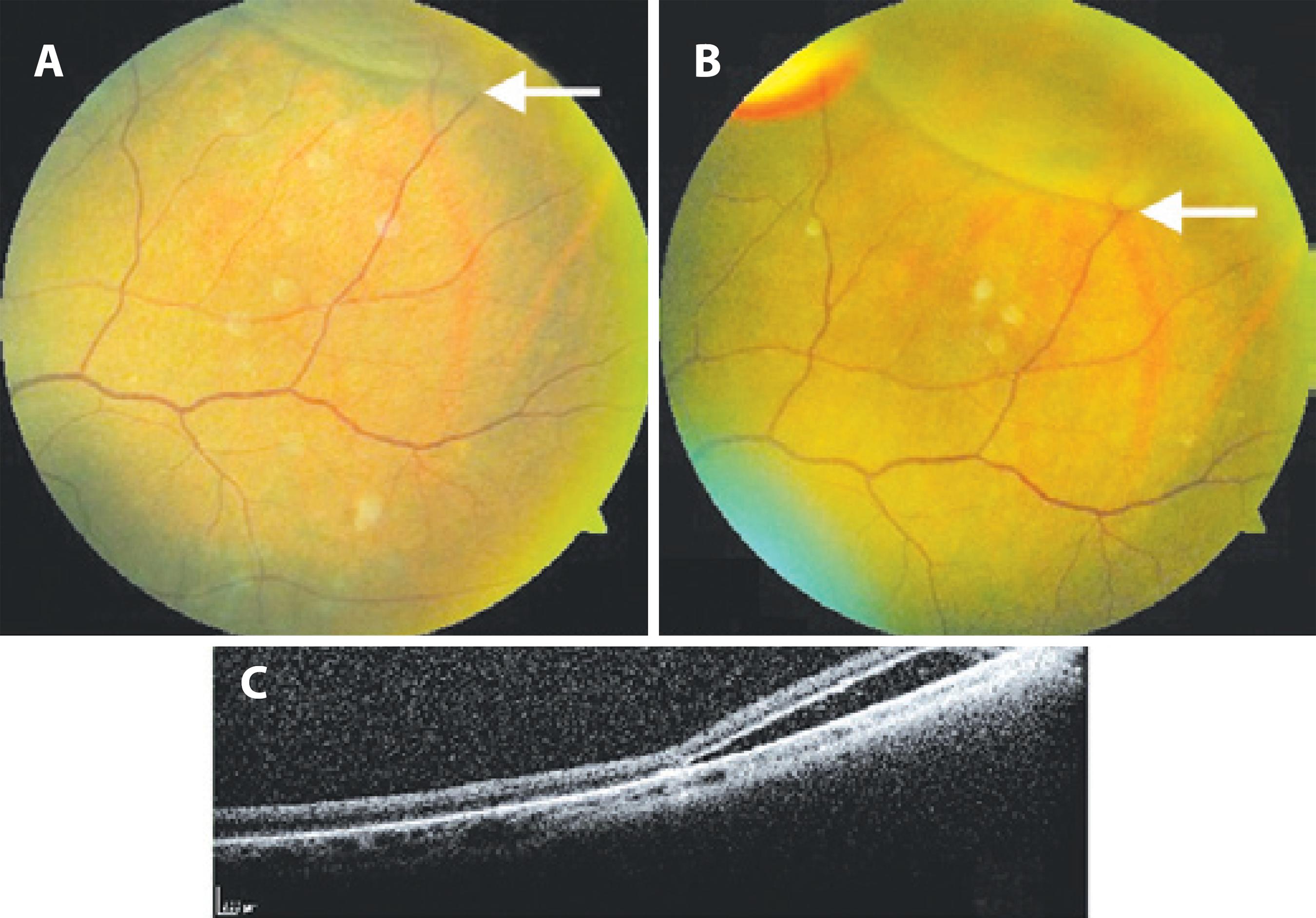 Figure 3 A and B) Retinal detachment in the area of retinoschisis in the superior temporal quadrant of the left eye with evidence of progression (note the retinal detachment approaching the vascular bifurcation indicated by the arrow in B); C) Optical coherence tomography with evidence of subretinal fluid.