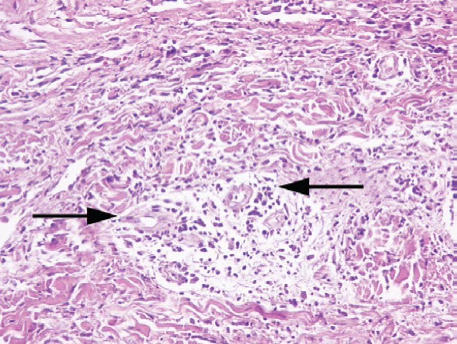 Figure 1 Perivascular mixed-type inflammatory infiltrate and edema without vasculitis (H&E stain, ×20).