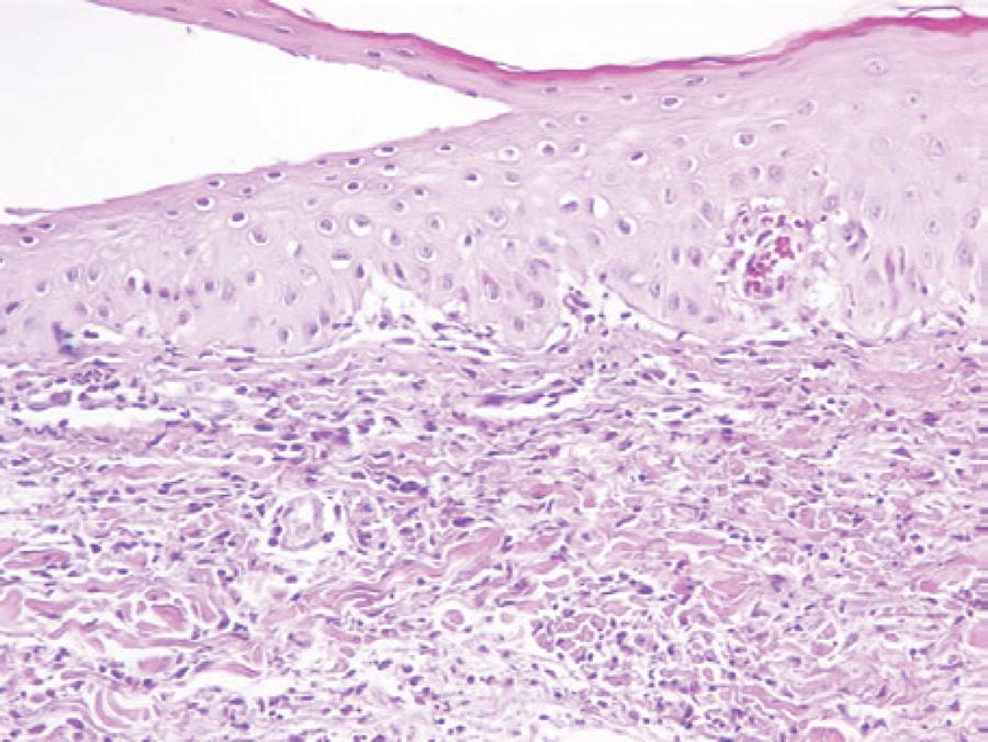 Figure 2 Neutrophilic infiltrate and edema in the upper dermis and exocytosis of neutrophils in the epidermis (H&E stain, ×20).
