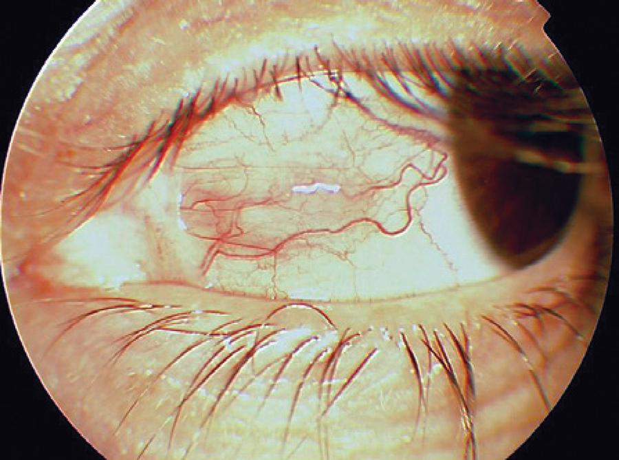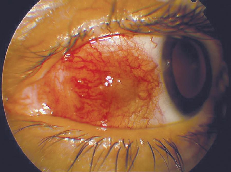 Sweet syndrome predominantly affects women and most frequently occurs between the ages of 30 to 50 years. However, children and younger adults may also be affected by the disease( 6 ). Patients may have extracutaneous manifestations involving the eyes, kidneys, bone, liver, central nervous system, intestines, heart, mouth, muscles, spleen, and lungs. Of all cases 15%-20% are associated with hematological malignancies (most commonly acute myelogenous leukemia) and solid tumors (most commonly carcinomas of the genitourinary organs, breast, and gastrointestinal tract). Ocular involvement has been reported in 4%-72% of patients with Sweet syndrome and ocular manifestations include conjunctivitis, episcleritis, subconjunctival hemorrhage, scleritis, inflammatory glaucoma, choroiditis, iritis, optic nerve involvement, limbal nodules, periorbital eruption, or orbital and eyelid inflammation with vesicular lesions( 5 , 7 , 8 ). Systemic corticosteroids (oral prednisone or prednisolone) are the mainstays of treatment for Sweet syndrome( 9 ). The ocular lesions of patients have resolved with systemic corticosteroids and topical corticosteroid eye drop treatment. Although the ocular lesions respond well to treatment, the dermatological lesions may persist or recur even when the patient is on systemic corticosteroid treatment( 2 ). Our case indicates that ulcerative keratitis and scleritis may be associated with active or inactive dermatological inflammatory diseases and should prompt systemic and laboratory investigation.