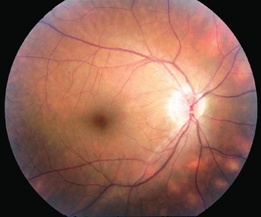 Figure 1 Typical "birdshot lesions" (cream-colored choroidal lesions with indistinct borders) in an individual with birdshot retinochoroidopathy.