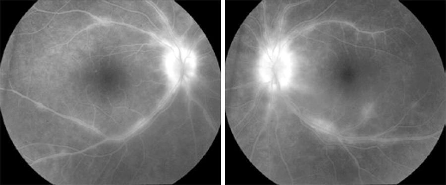 Figure 2 Fluorescein angiogram revealing bilateral phebitis and papillitis in a case of birdshot retinochoroidopathy.