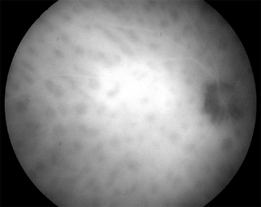Figure 3 Indocyanine green angiogram detecting hypolucent round lesions corresponding to areas of choroidal vascular nonperfusion.