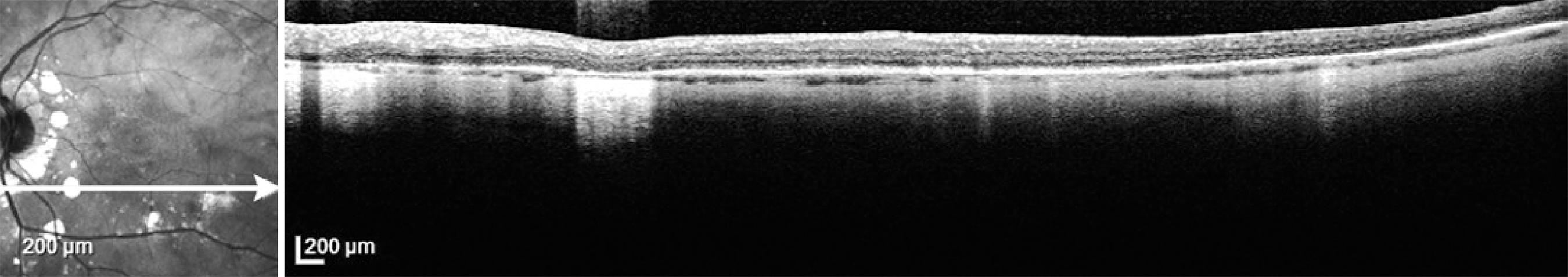 Figure 4 Optical coherence tomography of the left eye showing localized areas of retinal pigment epithelium atrophy (BSRC lesions) and thinning of the choroid in a patient with birdshot retinochoroidopathy.