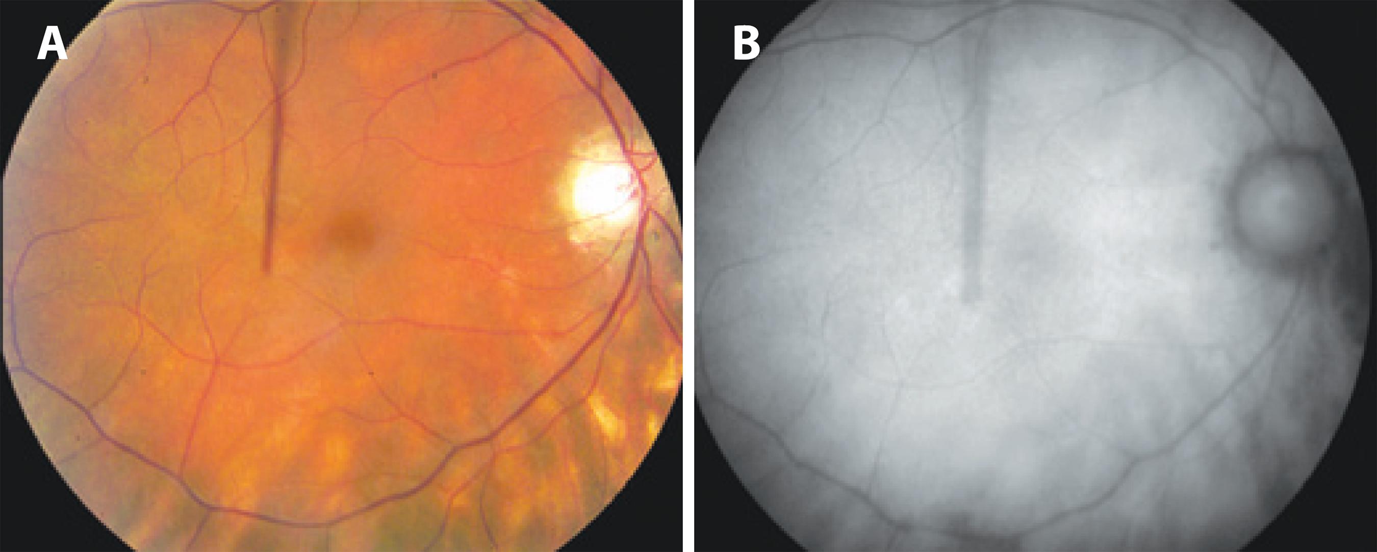 Figure 5 A) Fundus color photograph shows poorly pigmented fundus with BSCR lesions nasal and inferior to the optic nerve. B) Fundus autofluorescence shows scattered areas of retinal pigment epithelium atrophy as hypoautofluorescent spots corresponding to the BSCR lesions visible in the color photograph.