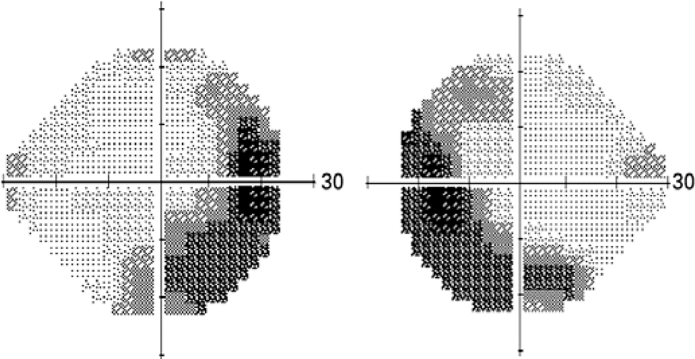 Figure 6 Visual field test (SITA-SWAP) showing peripheral visual field changes in active birdshot disease.