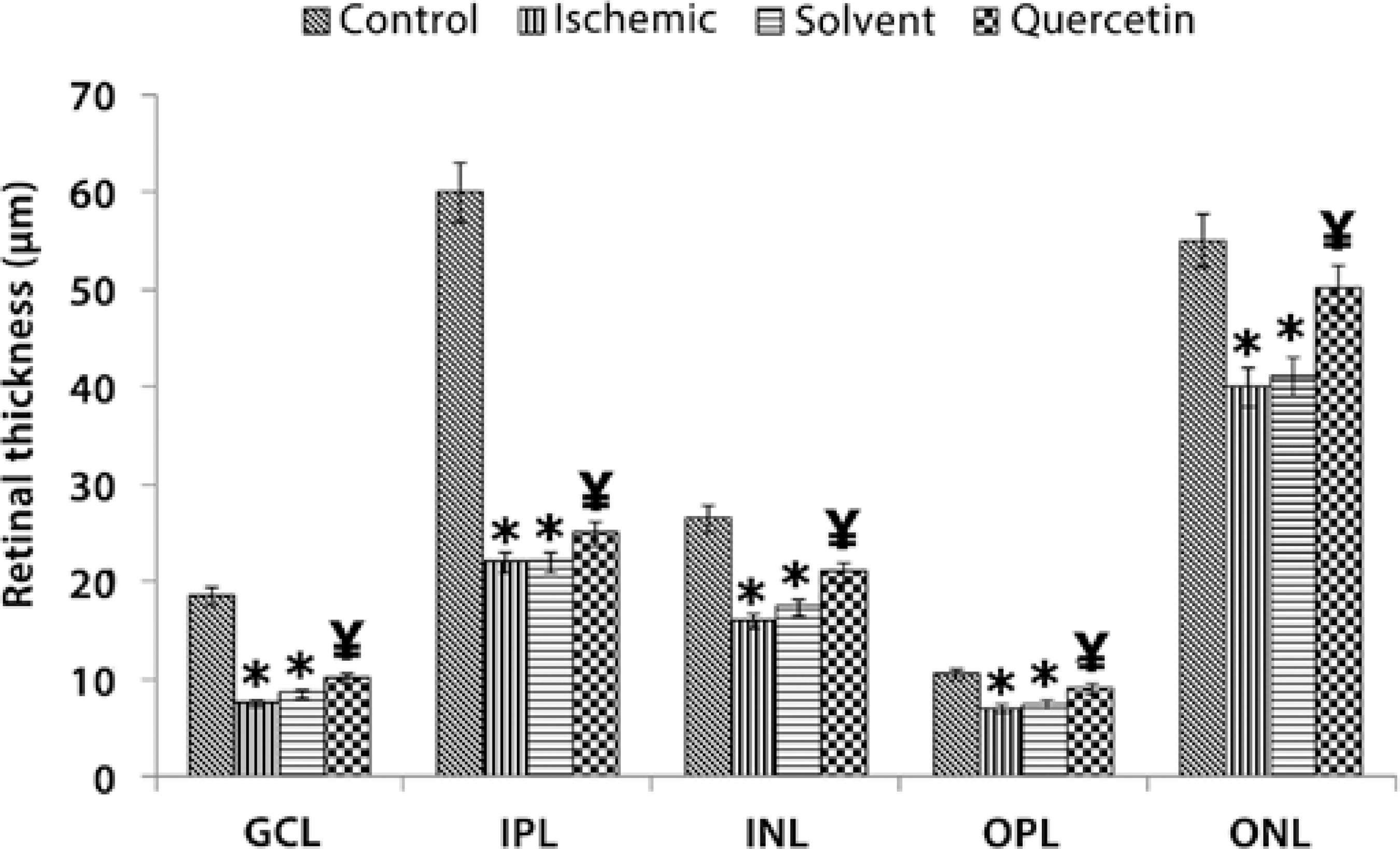 The mean thicknesses of RGCL, IPL, OPL, INL, and ONL were 19 ± 2.7 µm, 60 ± 12.1 µm, 11 ± 3.0 µm, 27 ± 9.9 µm, and 55 ± 13.3 µm, respectively, in the control group; 8 ± 1.4 µm; 22 ± 6.5 µm, 7 ± 1.9 µm, 16 ± 6.4 µm, and 40 ± 8.7 µm in the ischemic group; 9 ± 0.9 µm, 22 ± 7.4 µm, 7.4 ± 1.6 µm, 17 ± 5.2, and 41 ± 10.2 µm in the solvent group; and 10 ± 3.8 µm, 25 ± 8.2 µm, 9 ± 2.4 µm, 21 ± 5.6 µm, and 50 ± 12.8 µm, respectively, in the quercetin group (Figures 1 and 2).