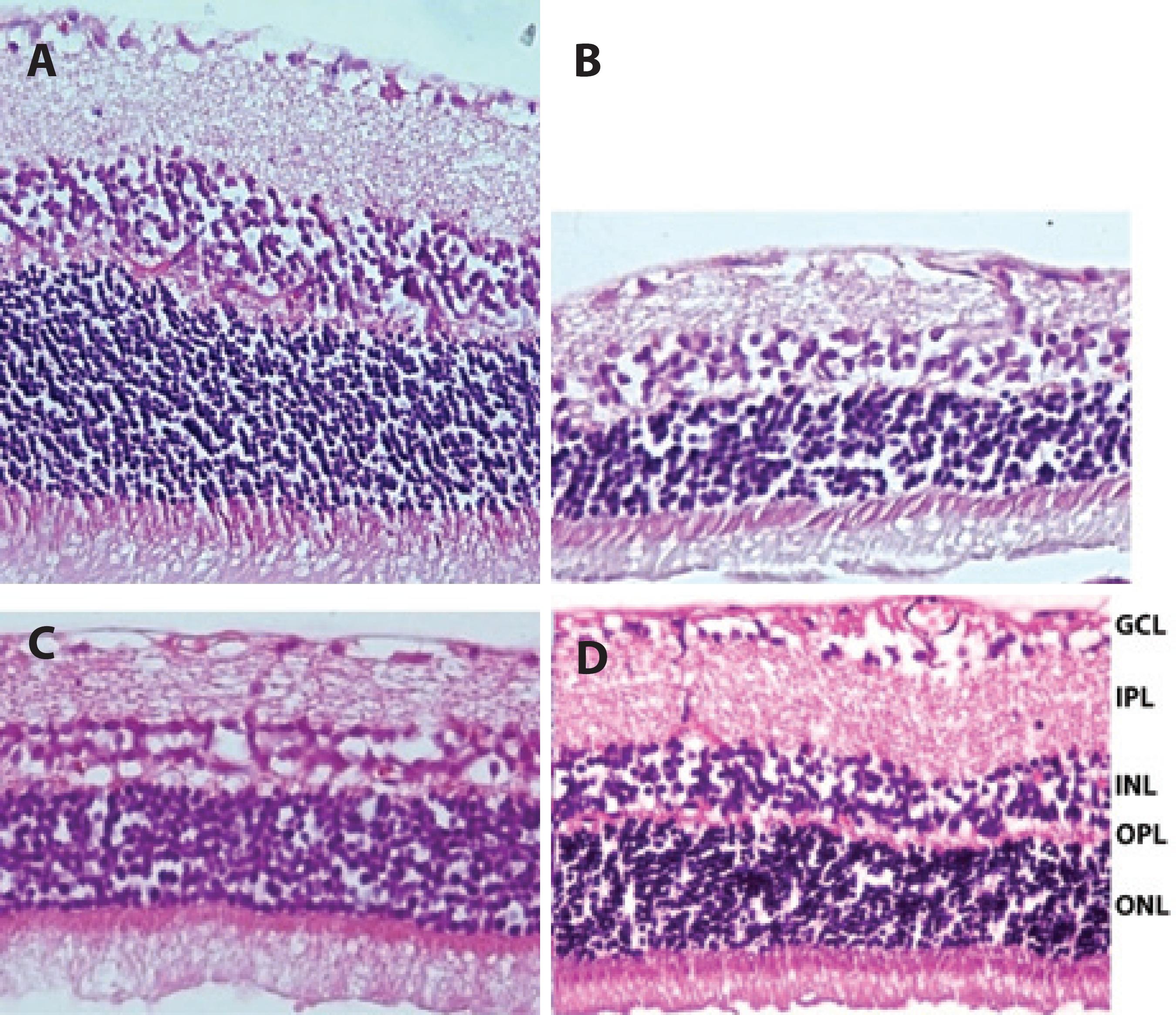 Figure 2 Representative photographs showing retinal thickness detected in the rat retina. A) Normal appearance of the retina (control group). B and C) Retinal thickness in the ischemic group and solvent group, respectively; in both of B and C, the thicknesses of the retina was found to be significantly reduced after ischemia. D) Retinal thickness in the quercetin group. Total retinal thickness in the quercetin group was significantly less reduced compared with the ischemic group at end of the experiment. H&E staining (×400).
