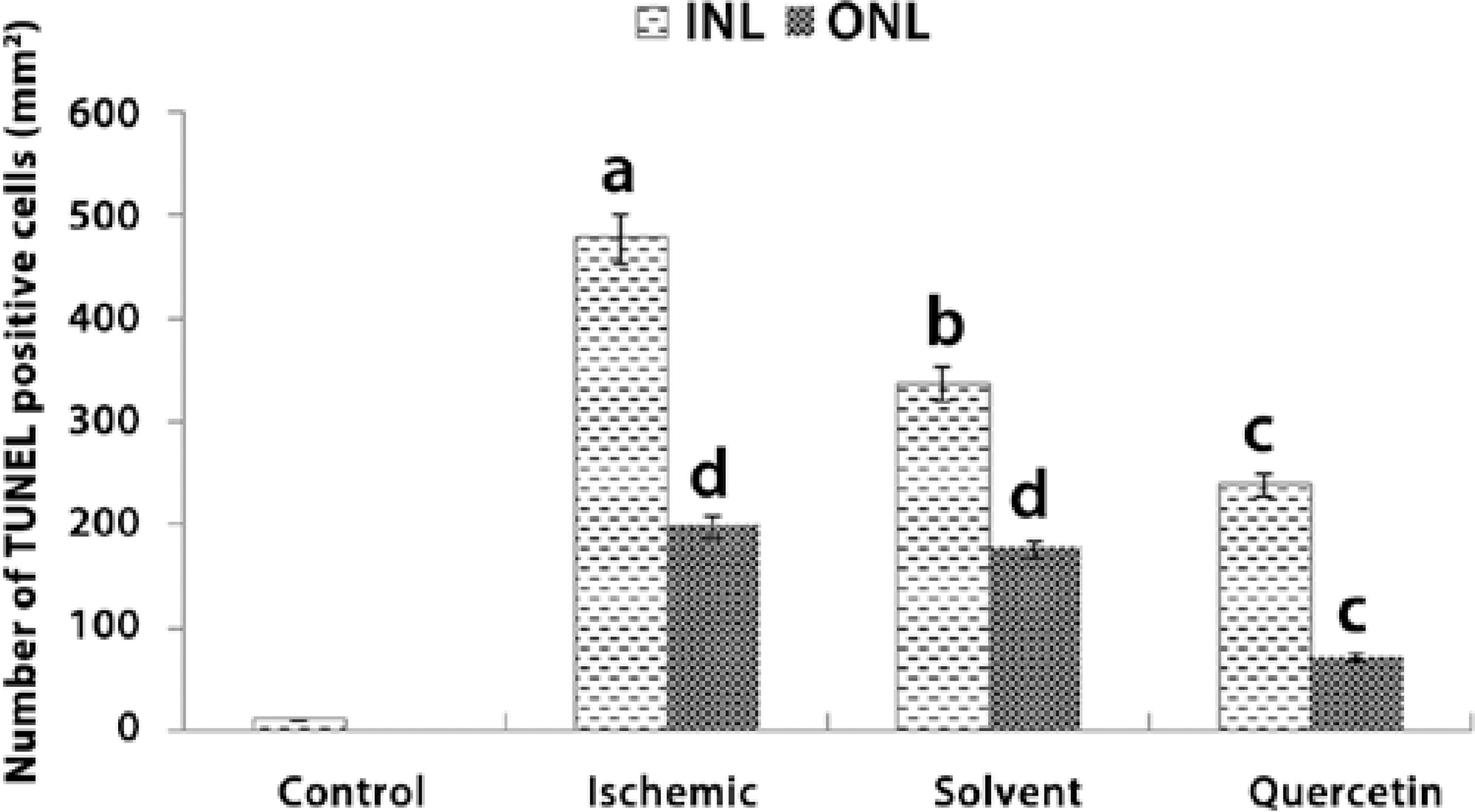 The effect of quercetin on the number of TUNEL (+) cells in INL and ONL