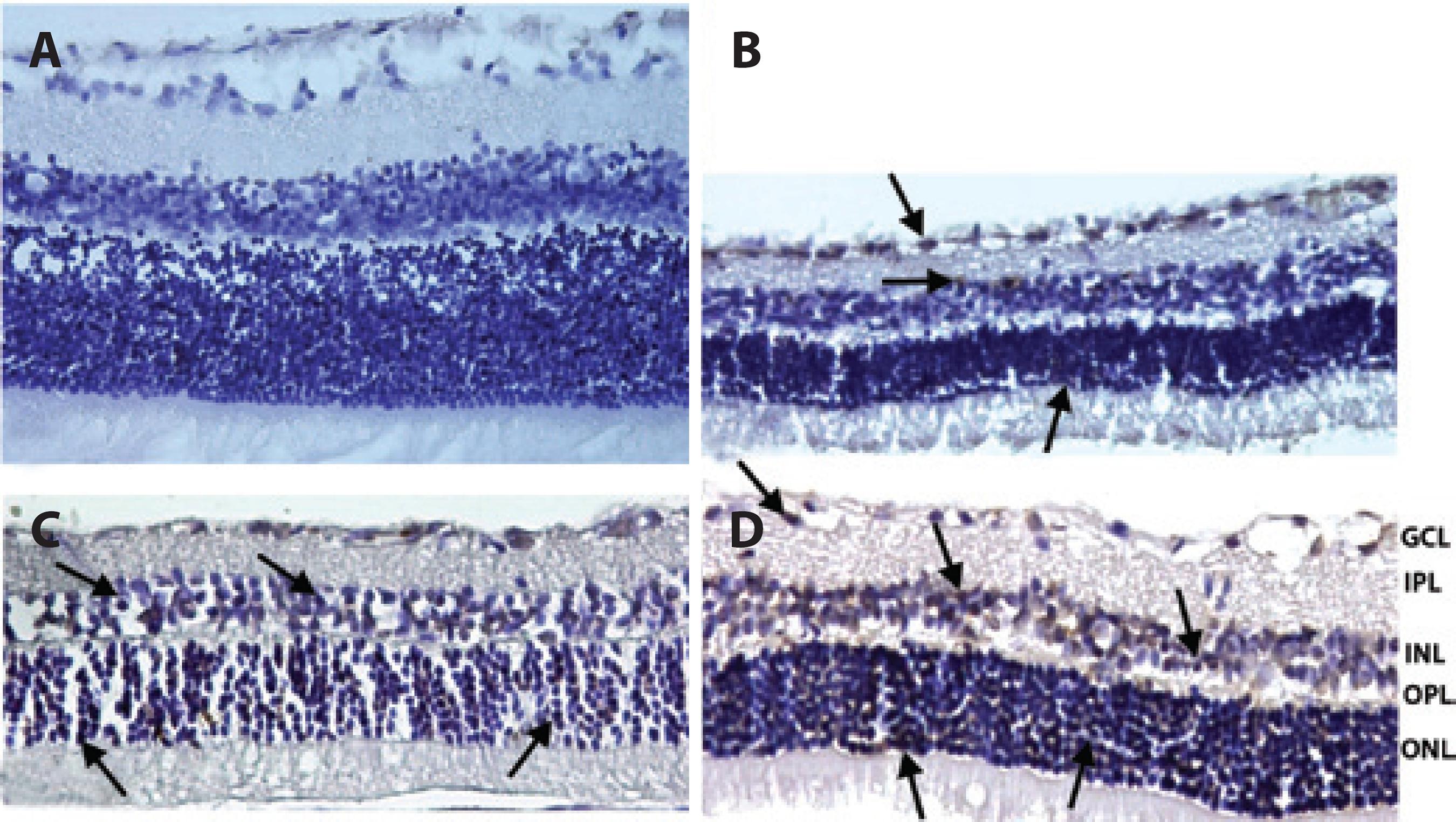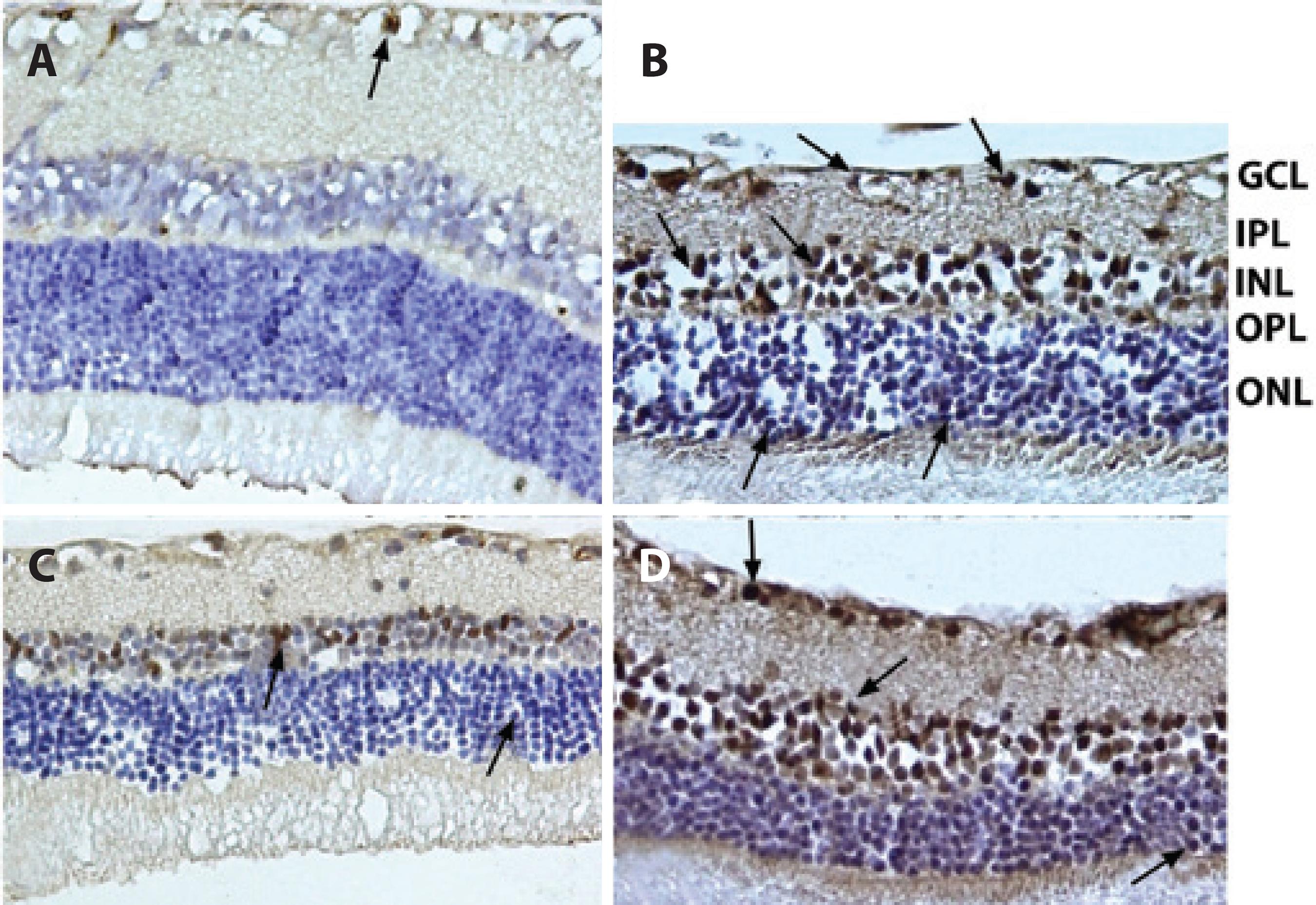 Figure 4 Representative photographs of TUNEL staining of rat retinas in control (A), ischemic (B), solvent (C), and quercetin (D) groups. The number of cells positive by TUNEL staining was increased in ischemic rats. However, treatment with quercetin markedly reduced retinal cell apoptosis. Arrows: TUNEL (+) cells. (×400).