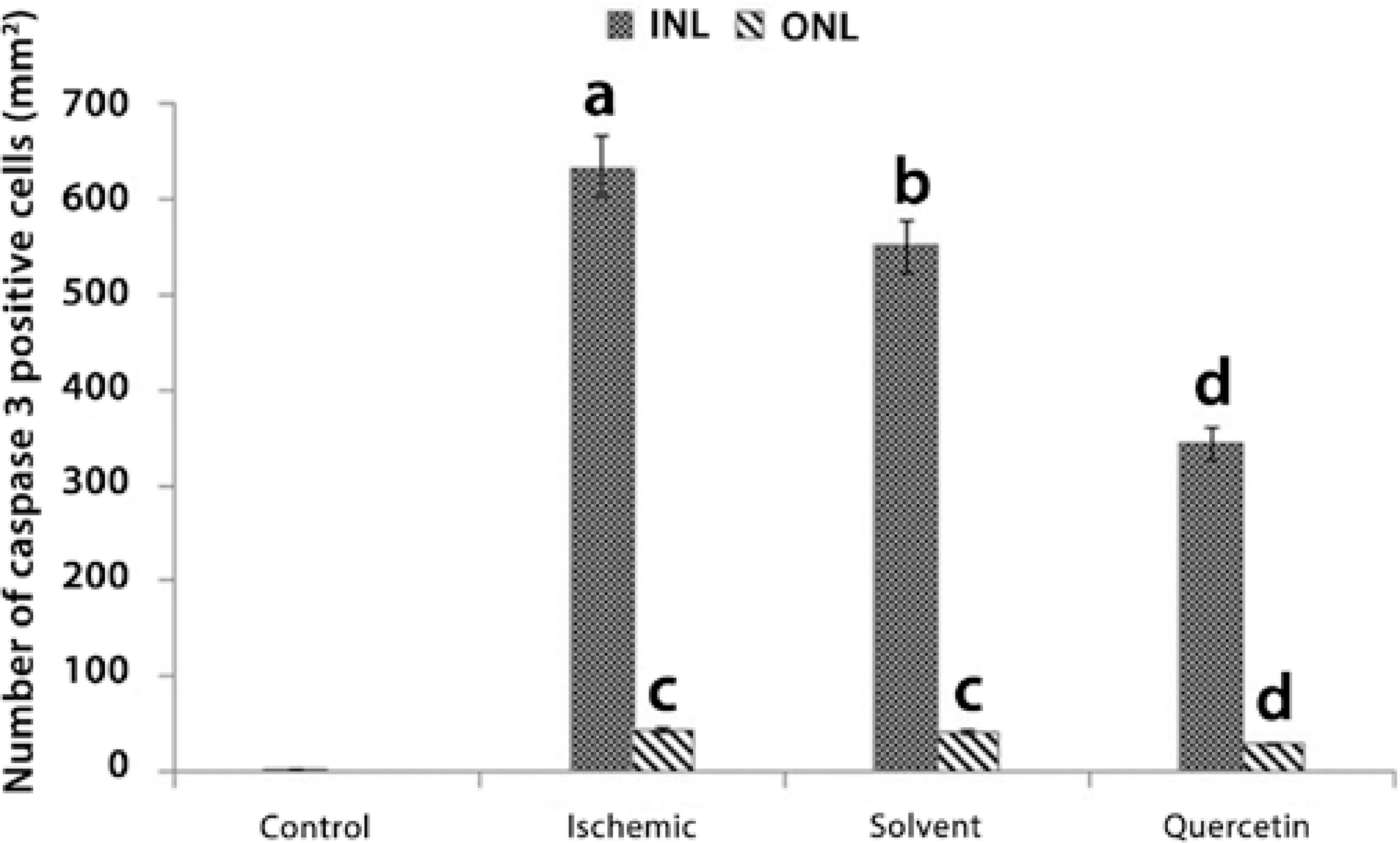 The antioxidant, free radical-scavenging, and neuroprotective effects of quercetin is well known(15-17). Besides these important benefits of quercetin, it also has a protective effect against apoptotic cell damage. Some experimental studies have revealed the antiapoptotic effect of quercetin on I/R injury in various organs(18,19); however, we have not been able to find any experimental studies evaluating the benefit of quercetin in treatment of I/R injury of the retina.