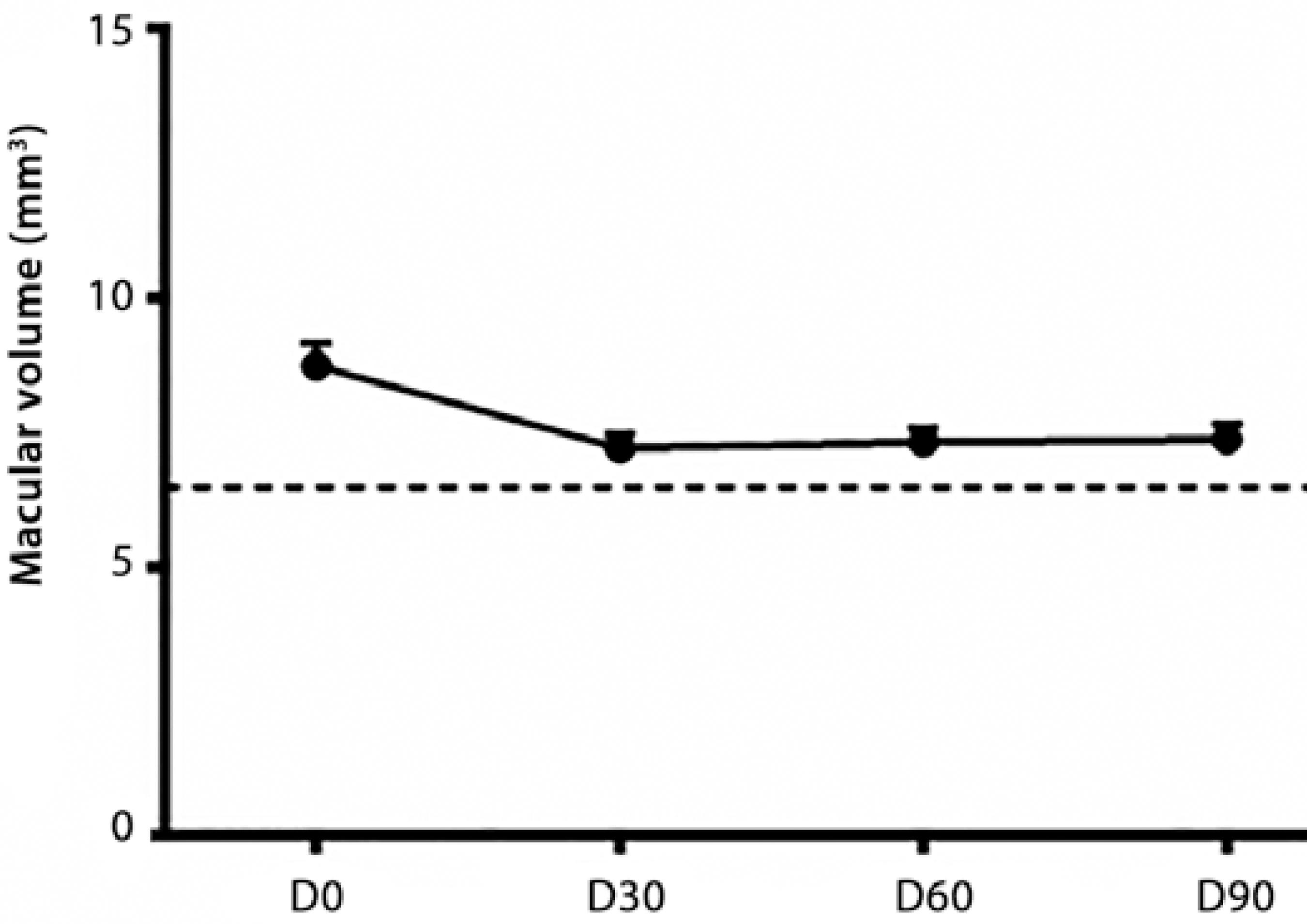Figure 1 Optical coherence tomography (OCT) of macular volume of controls (dashed line) and patients (D0, D30, D60, and D90).