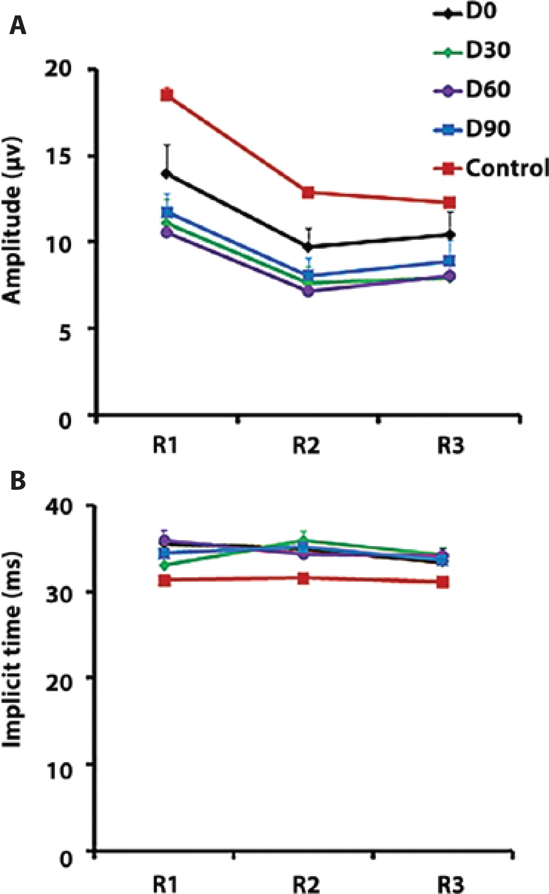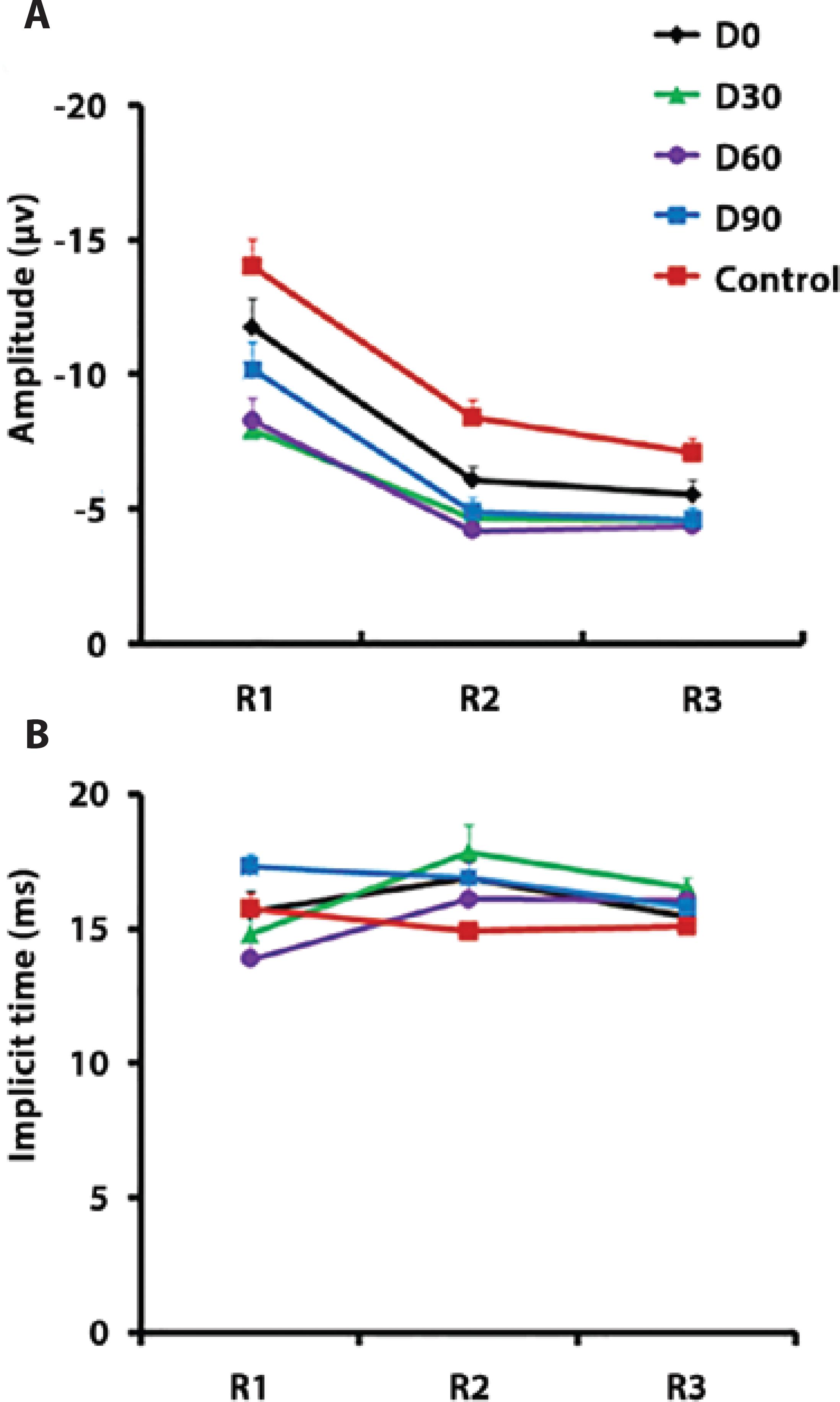 In R1 and R2, N1 implicit time was not significantly different in patients and controls (Figure 3 B). In R3, N1 amplitude was delayed at D30 compared with that in controls (P<0.05, one-way ANOVA, Tukey’s post-hoc test; Figure 3 B).
