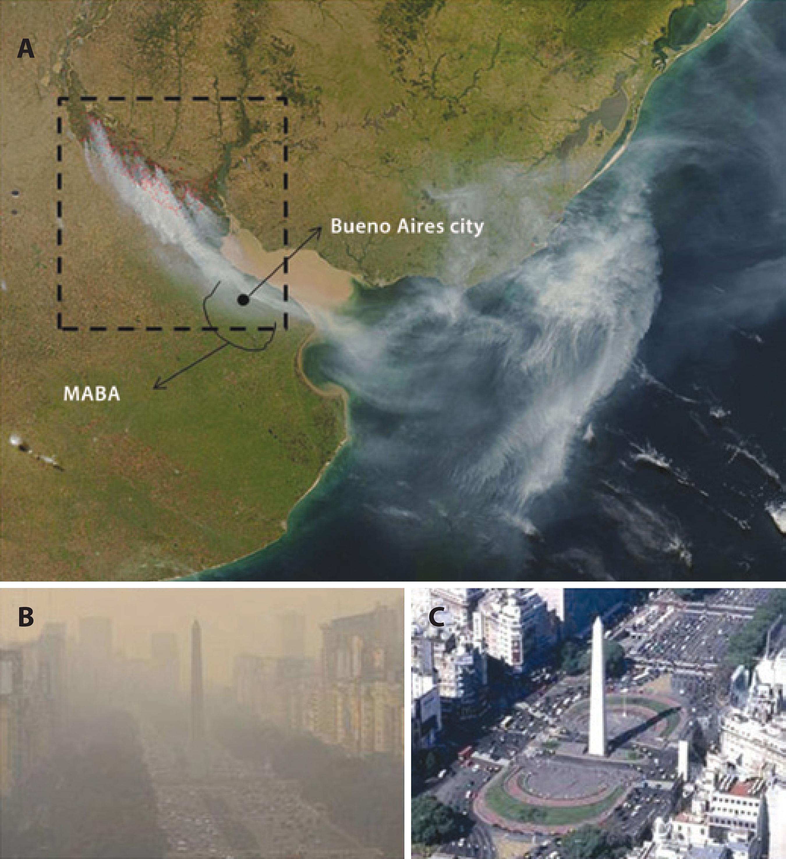 In the Delta Islands of the Paraná River, approximately 112 miles away from the city of Buenos Aires, pasture burning for grazing livestock is a fairly common practice. Between April 16th and April 24th 2008, there was a series of wildfires that affected over 70,000 hectares. The extent of the fire, the drought, and the wind direction generated a thick cloud of smoke that caused the most severe episode of acute air pollution in the MABA ever recorded. The northern and northeastern areas of the province of Buenos Aires, including MABA, had been swathed in thick smoke (Figure 1 A, B). It is estimated that the wildfires of the Delta of the Paraná River affected approximately 20 million people. The smoke was so dense in the city of Buenos Aires that on April 18th, the airports and highways were closed, and classes in all schools were suspended (Figure 1 B, C). The levels of carbon monoxide (CO), nitrogen dioxide (NO2), and particulate matter (PM) registered during the episode were the highest ever registered in the region of the River de la Plata.