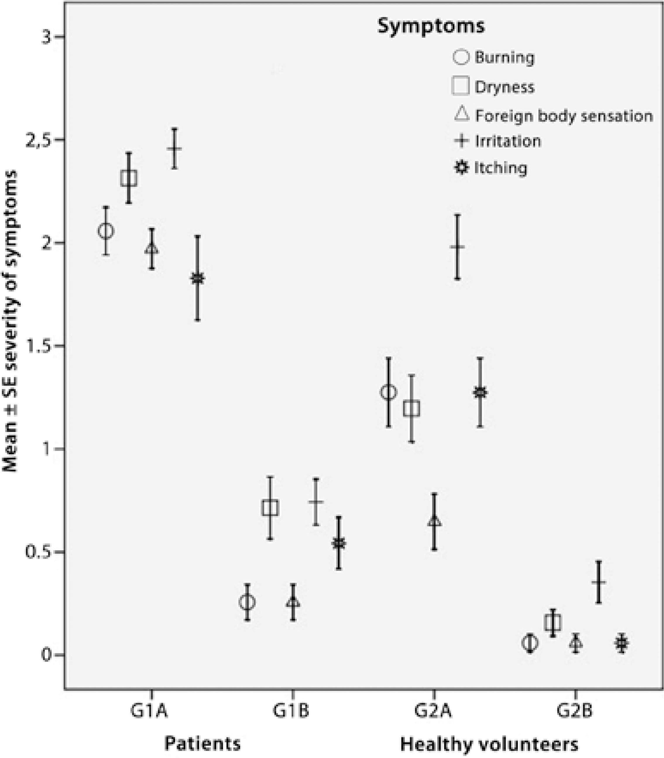 A total of 51 healthy volunteers were evaluated, including 23 women and 28 men, with an average age of 39.1 ± 11.9 years. During the acute episode, 79% of healthy volunteers (G2A) experienced at least three of the symptoms evaluated. The most frequent and severe symptom was ocular irritation (80%). Most people reported sustaining ocular irritation during the whole day (55%) or at the end of the day (41%). In addition, 65% reported worsening of the symptoms when outdoors and 57% experienced these symptoms for the first time. There was a significant difference in the frequency and severity of the symptoms when the healthy volunteers were compared over time, i.e., during vs. after the acute episode (G2A vs. G2B, p<0.01; Figure 2).