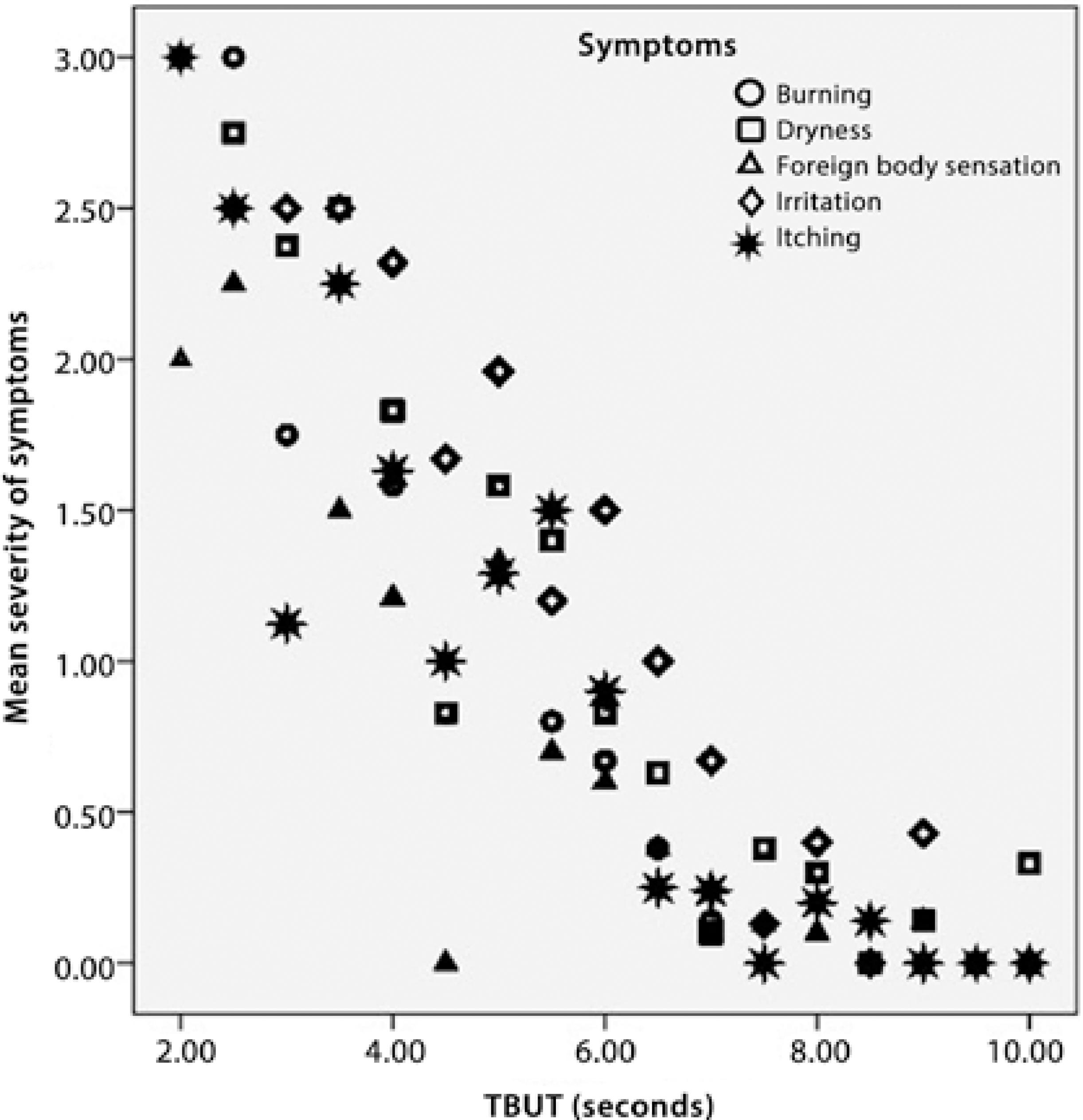 Figure 3 Correlation between severity of symptoms and tear break-up time (TBUT). There was a statistically significant correlation between the reported severity of ocular burning, dry eye, foreign body sensation, itching and irritation, and mean TBUT values. Values are expressed as means ± 0.95 confidence intervals.