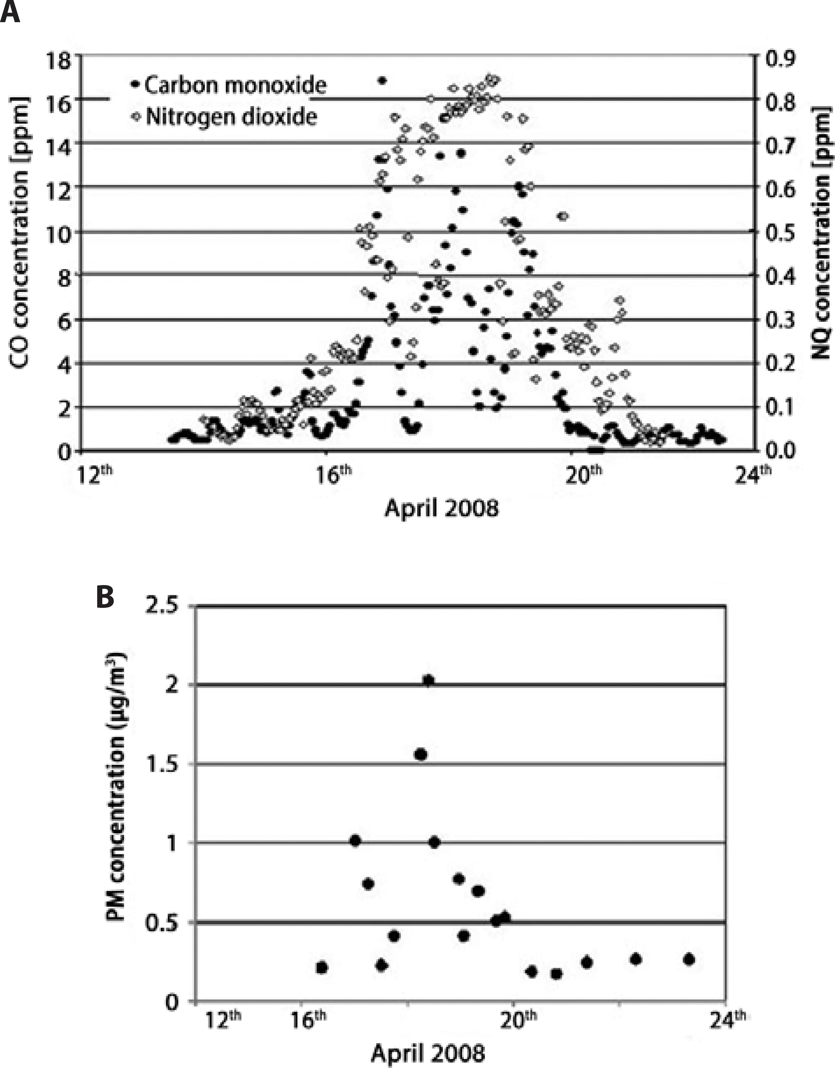 During April 16th to April 20th, the measured mean levels of CO, NO2, and PM concentrations were four times higher than the usual average levels for this time of the year. Figure 4 depicts the concentrations of these substances before, during, and after the episode. Hourly measured values of CO reached 17 ppm on April 17th, which is 8.5 times as much as the average value (approximately 2 ppm) registered in the area. Moreover, the 8 hours average value was greater than the standard value recommended by the WHO Air Quality Guidelines (AQG) established by the World Health Organization(22) in 29 opportunities. For NO2 and PM, average levels are usually not exceeding 50% of the maximum levels recommended by the WHO, but during the acute episode, the concentrations were twice as high as those recommended in the WHO guidelines(23-24).