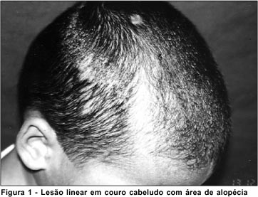 Ao exame observava-se uma lesão linear no couro cabeludo à direita, de coloração acastanhada, com presença de alopécia na região (Figura 1).