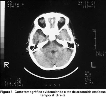 A criança apresentava desenvolvimento neuropsicomotor próprio para a idade, sem outras alterações sistêmicas. A tomografia computadorizada de crânio evidenciou um cisto de aracnóide na fossa temporal direita (Figura 3).