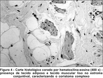 Alguns coristomas são chamados complexos por apresentarem elementos ectodérmicos e mesodérmicos. Estes coristomas são os mais raros e podem conter cartilagem, tecido adiposo, glândula lacrimal, músculo liso e osso(2). No presente caso a presença de tecido muscular liso e adiposo confirmou o diagnóstico de coristoma complexo.